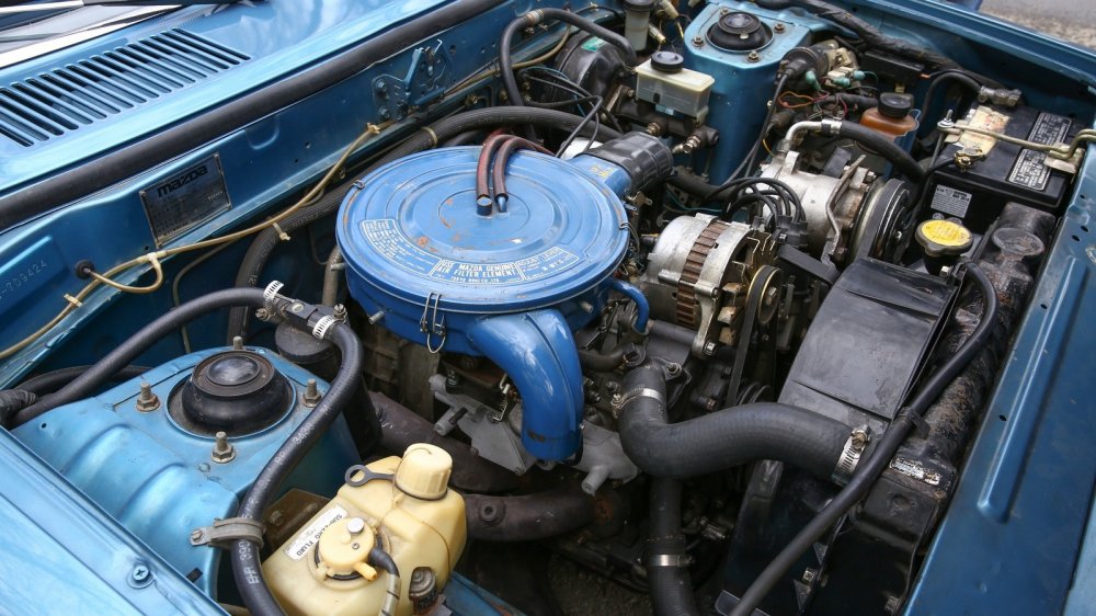 Как и все старые «роторы», 13B имеет очень удобную для обслуживания конфигурацию – это продольно расположенный под капотом «бочонок», дающий легкий доступ и к свечам, и к стартеру, и к генератору, и к компрессору кондиционера, не говоря уж про карбюратор, прикрытый классическим дисковым корпусом воздушного фильтра. Шикарно расположен масляный фильтр – прямо сверху мотора, вертикально, что позволяет не пачкать подкапотное пространство потеками масла при его замене.