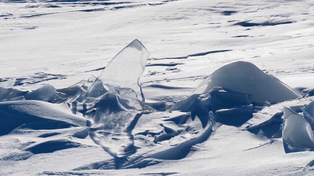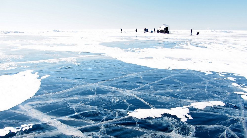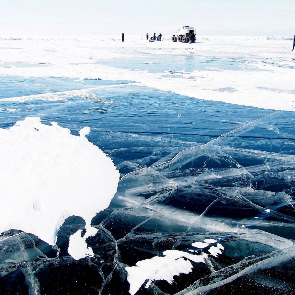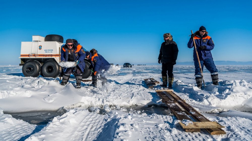 Ну а самыми серьезными препятствиями стали две обрамленные торосами трещины. Как рассказали сотрудники МЧС, они тянутся вдоль всего Байкала, от самой северной до самой южной его точки. Своим происхождением они обязаны господствующим ветрам, сталкивающим ледяные поля и превращающие их гряды жестких, как зубья, надолбов. Вот тут организаторам понадобились ломы, бензопилы и прихваченные с собой дощатые мостки. Кстати, именно эти трещины стали самой серьезной проблемой зимой 1904 года, когда все повисло на волоске, и снабжение сражающихся в Маньчжурии русских войск зависело от возможности перемещения вагонов через Байкал по проложенным на льду временным рельсам. Ширина трещин под рельсовым путём доходила до полутора метров, а сила движения льда была настолько велика, что рельсы лопались, а болты и скрепления разлетались в стороны.
