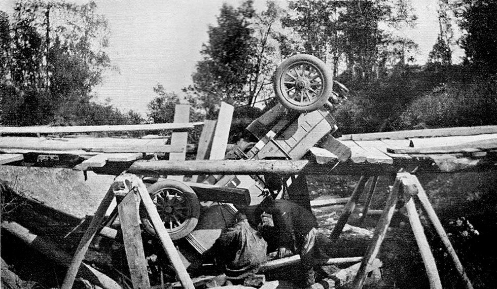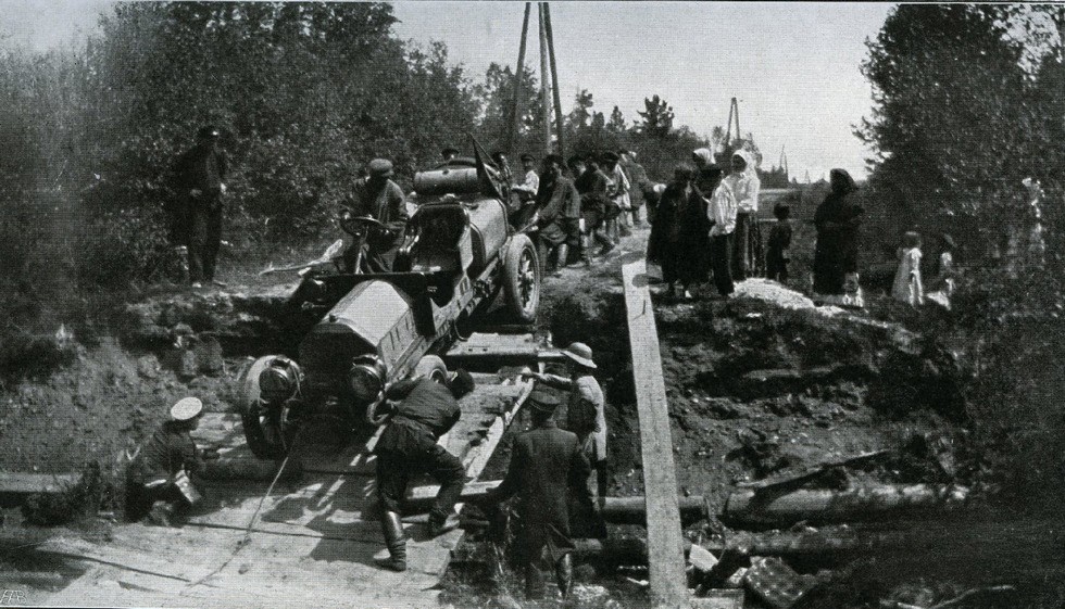 Потом была полная приключений паромная переправа через Селенгу, когда не приспособленный для перевозки автомобилей паром чуть не опрокинулся. Вновь вспоминая записки журналиста Барзини о практически полном отсутствии подходящих дорог, не удивляешься тому, что тогда в голову его напарника, князя Боргезе, пришла мысль двигаться непосредственно по полотну Транссиба. Но движение поездов заставляло то и дело съезжать с насыпи на гужевую дорогу (для этого князь прихватил с собой специальные доски). И вот в один из таких моментов старый полусгнивший мост провалился под колесами, и автомобиль рухнул в реку. Единственным пострадавшим оказался невезучий журналист Барзини, которого окатило горячим маслом из двигателя. Автомобиль под «Эй, ухнем» и пение «Дубинушки» вытащили на руках крестьяне из близлежащих деревень, ну а все последующие мосты Боргезе старался проскакивать ходом.
