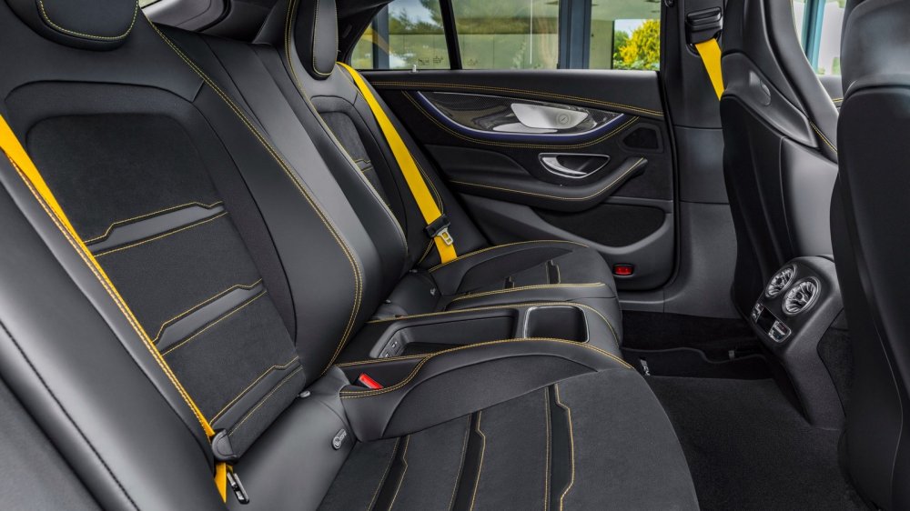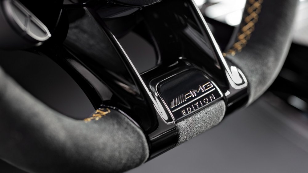 В салоне Edition 1 установлены сиденья AMG Performance с обивкой из кожи Exclusive nappa в комбинированной серо-черной гамме с желтой контрастной прострочкой, мультируль AMG Performance с обивкой из микрофибры Dinamica с желтой прострочкой, а также выполнена отделка матовым карбоном AMG.