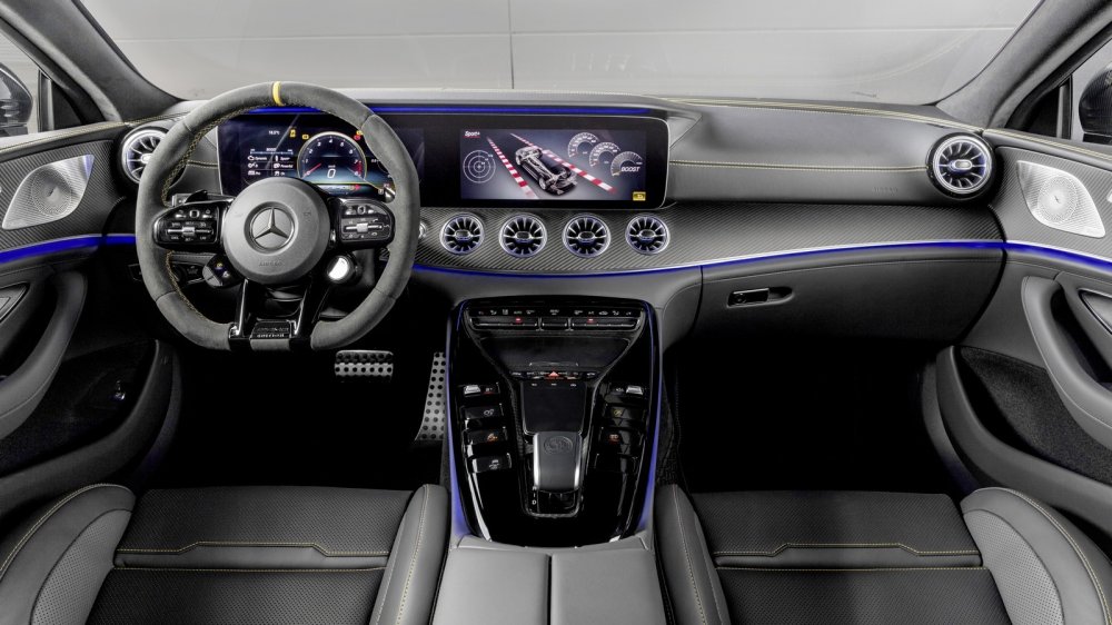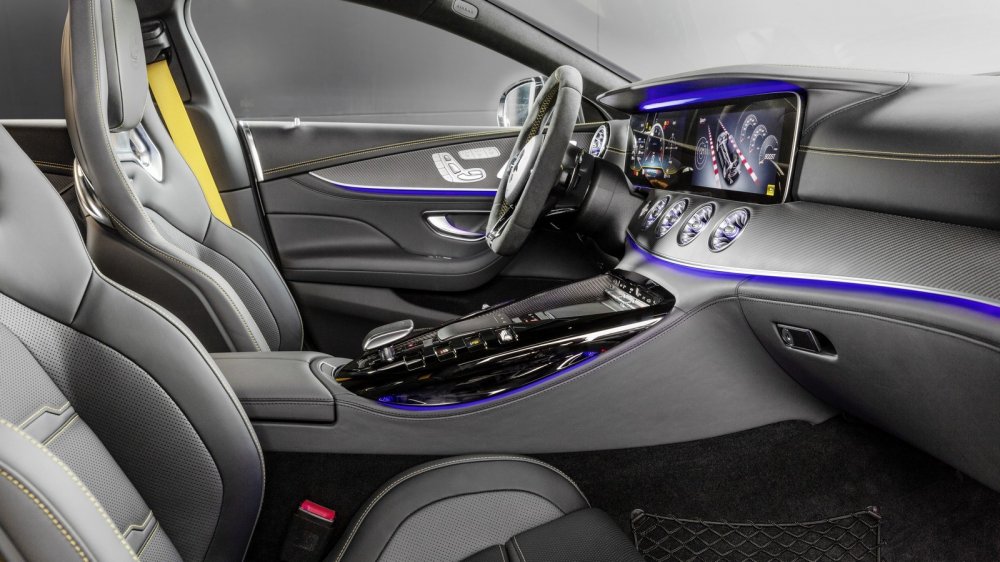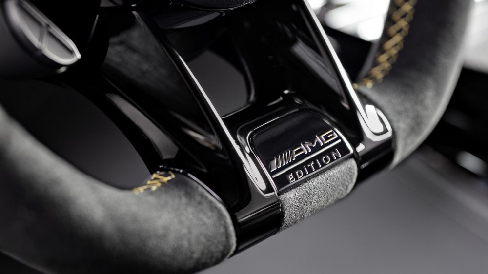 В оформлении салона используются кожаные обивки – серая Magma и черная Nappa с контрастной желтой прострочкой, используемой также на креслах AMG Multicontour. Установлен руль AMG с отделкой микрофиброй DINAMICA с использованием контрастной желтой прострочки, 12-часовым желтым маркером и бейджиком Edition 1. Кожей Nappa с желтой прострочкой отделаны также подлокотники, передняя панель и дверные панели. Еще имеется карбоновая отделка, желтые ремни безопасности и особые коврики.