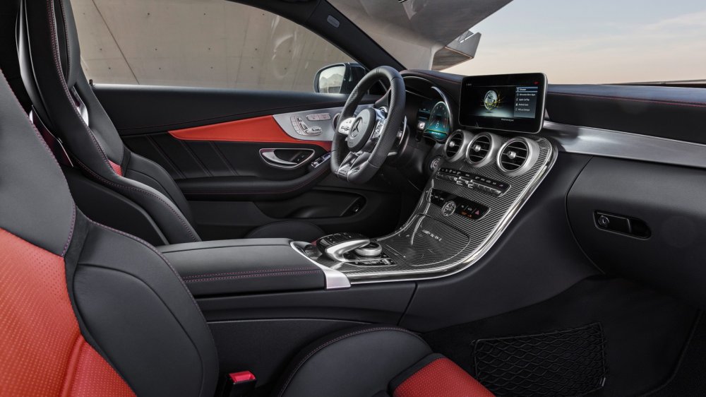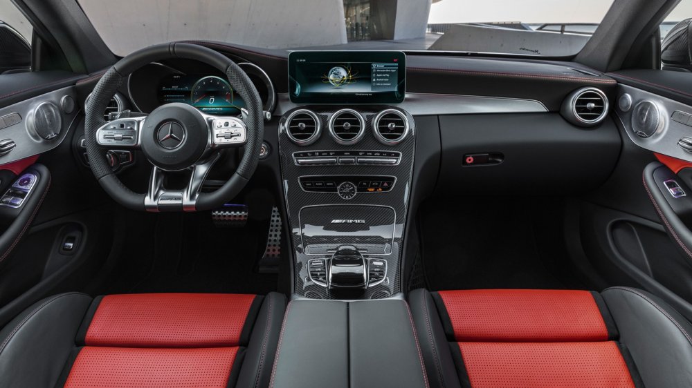 Интерьер обновлённого Mercedes-AMG C 63 изменился за счёт нового руля с сенсорными панелями на спицах, 10,25-дюймового широкоформатного дисплея мультимедийной системы, виртуальной комбинации приборов с дополнительными AMG-конфигурациями с большим тахометром в центре.