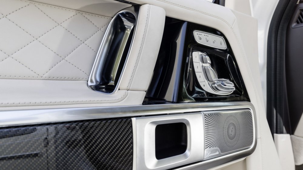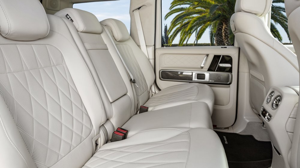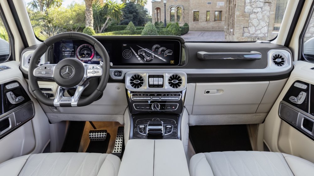 В салоне Mercedes-AMG G 63 установлено новые спортивное рулевое колесо AMG Performance с обивкой из кожи nappa, кнопка регулировки тембра звучания спортивной выпускной системы, спортивные мультиконтурные кресла и активный круиз-контроль.