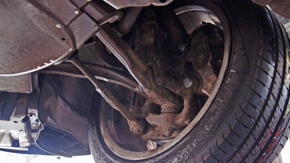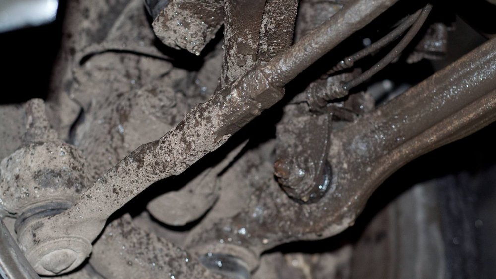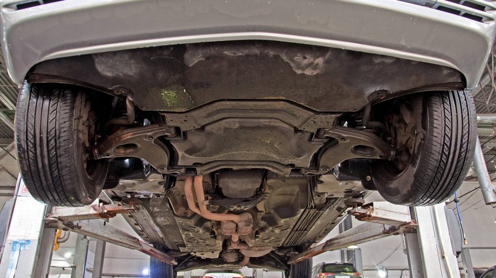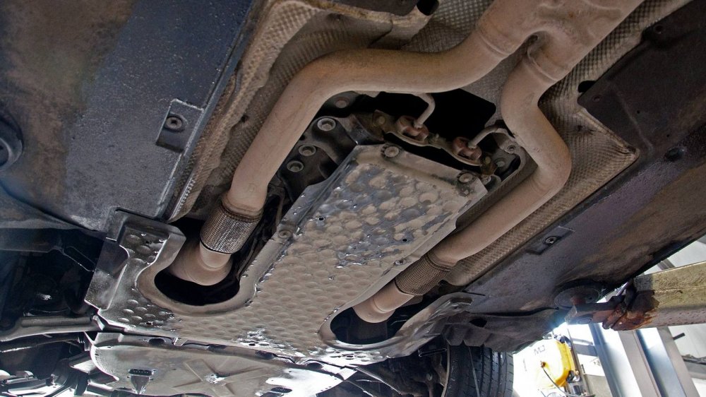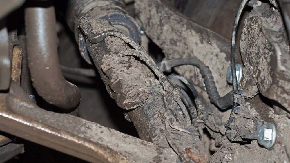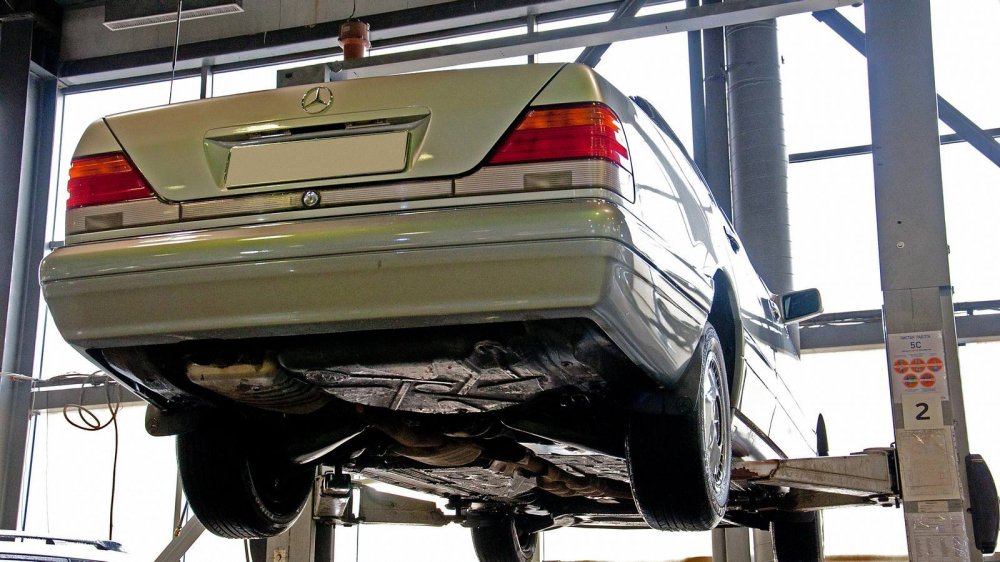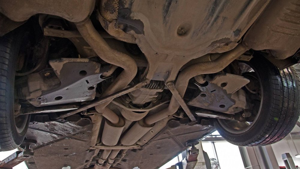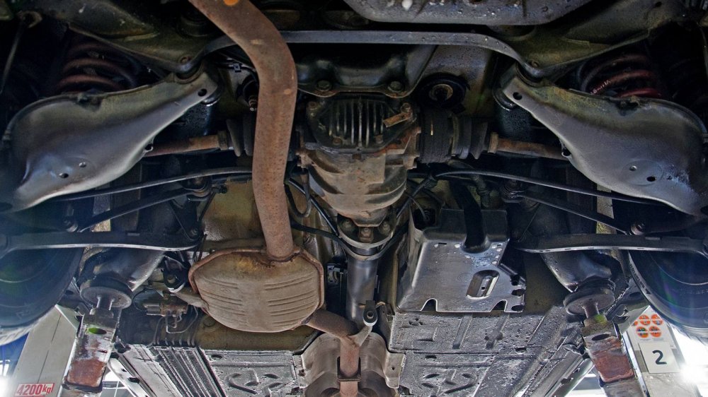 Подход к защите нижних элементов у W140 совершенно другой. Тут толком ничего не защищали, а просто делали все детали прочными сами по себе. Например, обратите внимание на глушитель. Кажется, что он скоро прогниёт насквозь. Но нет. То, что кажется страшной коррозией “банки”, на самом деле затронуло лишь её внешний защитный слой. Сам глушитель будет ржаветь ещё несколько лет.