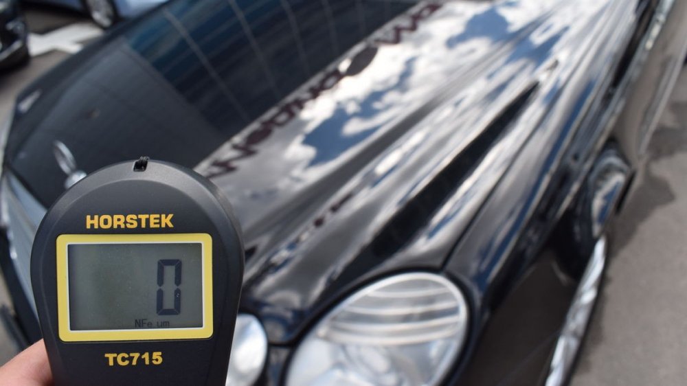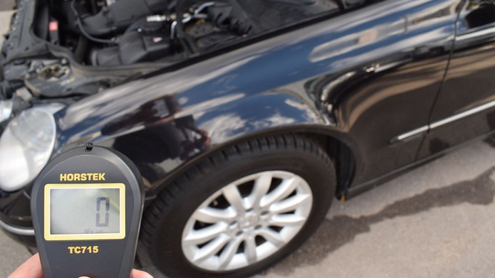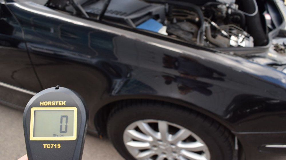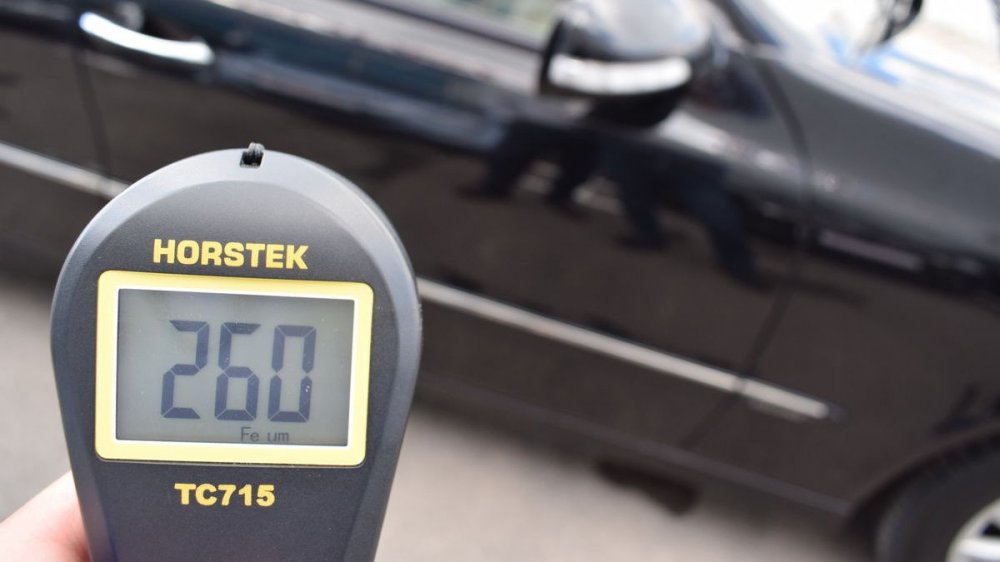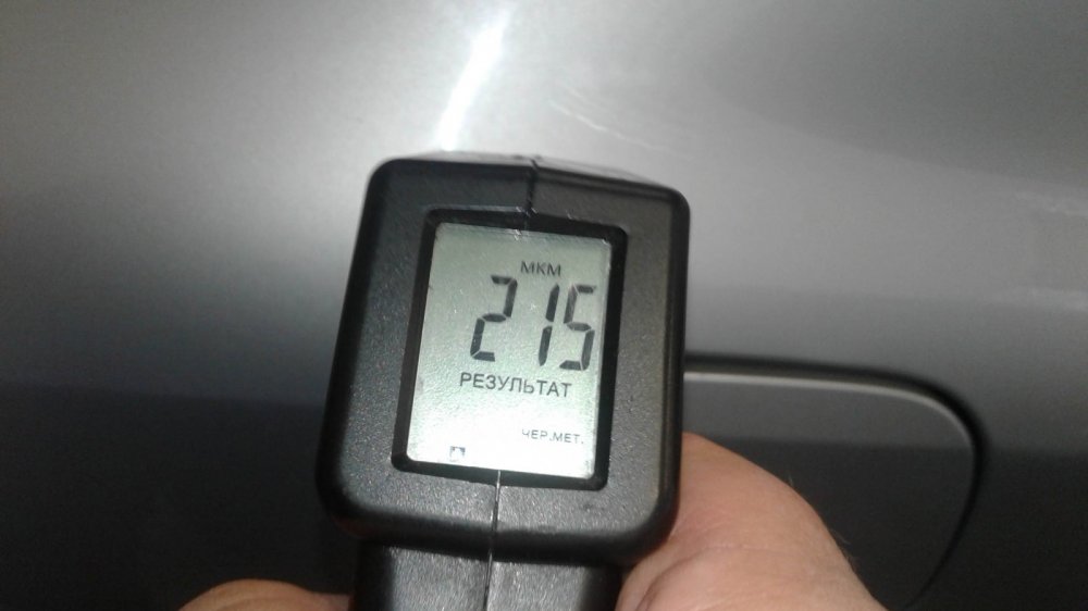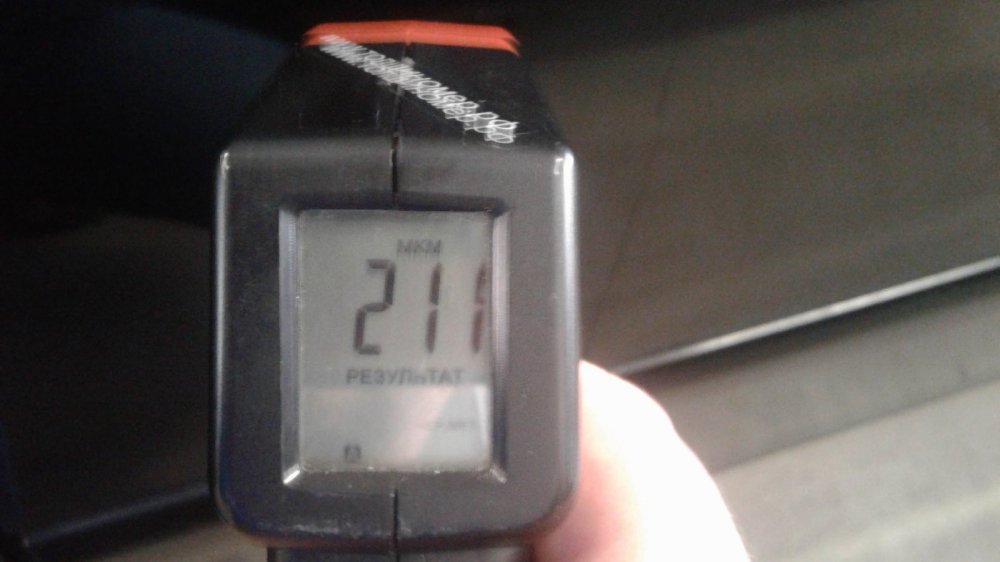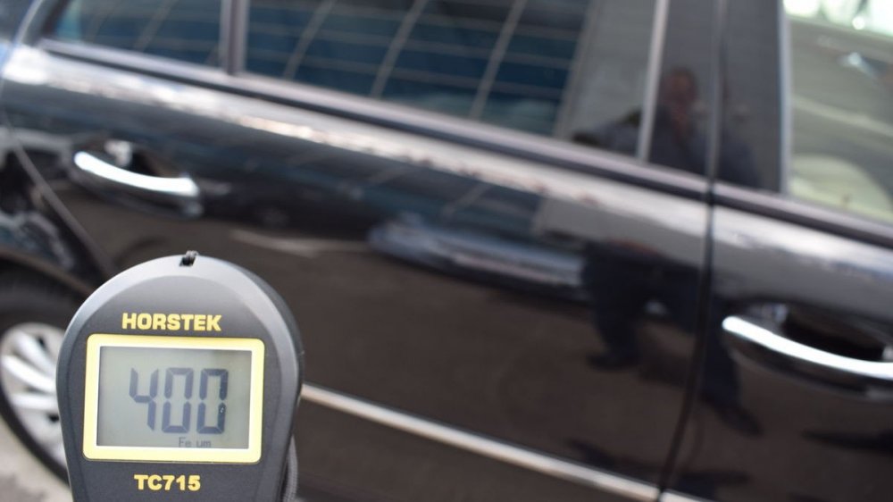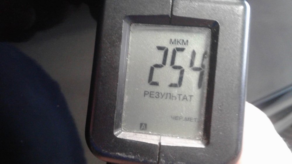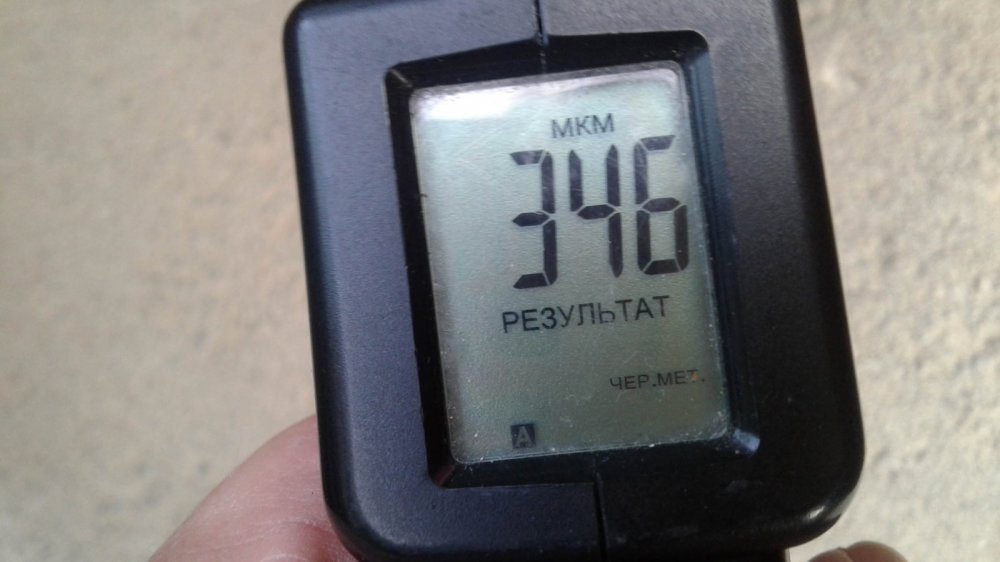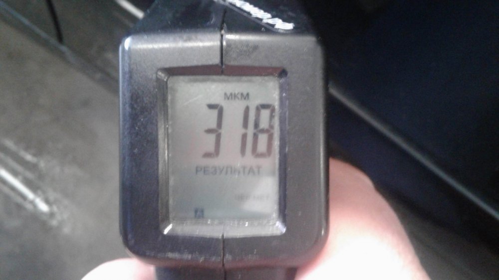 Кстати, хоть он и привёл кузов в порядок, один крашенный элемент (задняя правая дверь) всё-таки есть. Может быть, тут есть и немного шпатлёвки: почти 350 мкм — это чуть больше, чем нужно для простого двойного окраса.