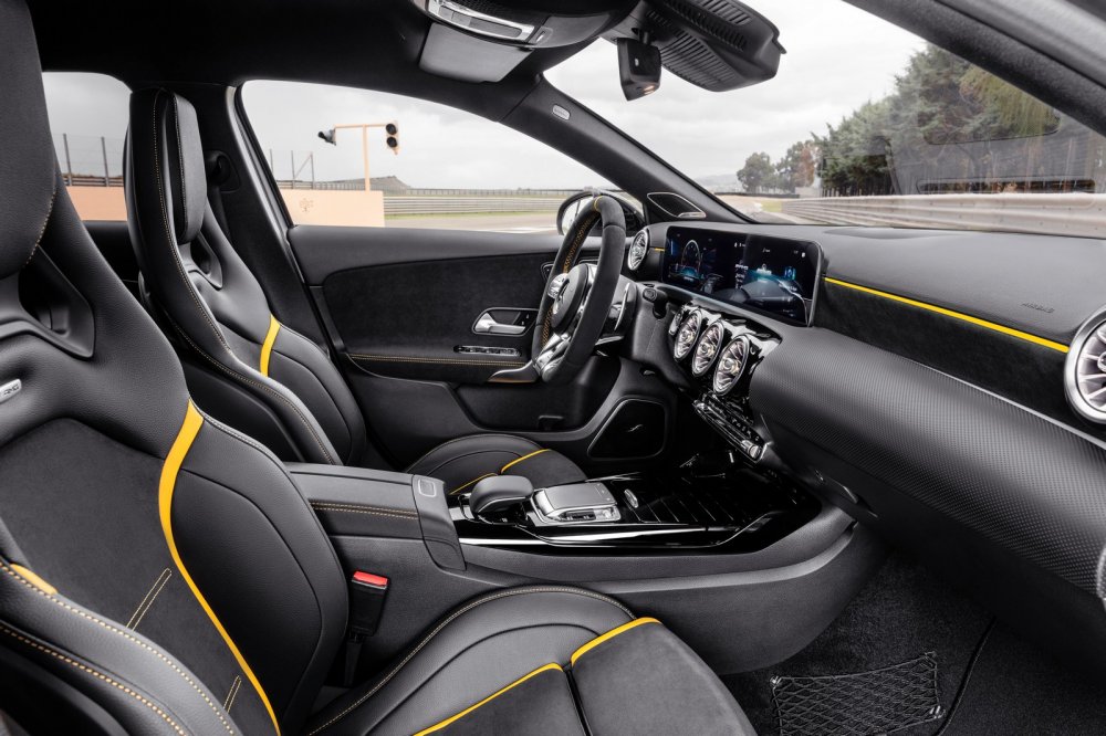Коробка в любом случае одна – 8-ступенчатый «автомат» с двумя мокрыми сцеплениями, а привод в любом случае полный, 4Matic+, подразумевающий на «сорок пятых» моделях две индивидуальные электромеханические многодисковые муфты отбора мощности на задние колёса. В муфты эти, судя по всему, заложен большой запас прочности и термостойкости, ибо разработчики предусмотрели дрифт-режим, позволяющий при отключенной ESP вести машину в длительных силовых скольжениях. Но быстрый старт с места доступен, разумеется, лишь при поддержке электроники: до 100 км/ч хэчтбек Mercedes-AMG A 45 S 4Matic+ в режиме Race-Start разгоняется за 3,9 с, а седан CLA 45 S 4Matic+ за 4,0 с. Максимальная скорость ограничена на уровне 250 км/ч, но с опцией AMG Driver‘s Package электронную удавку сдвигают до 270 км/ч – платите денежки!