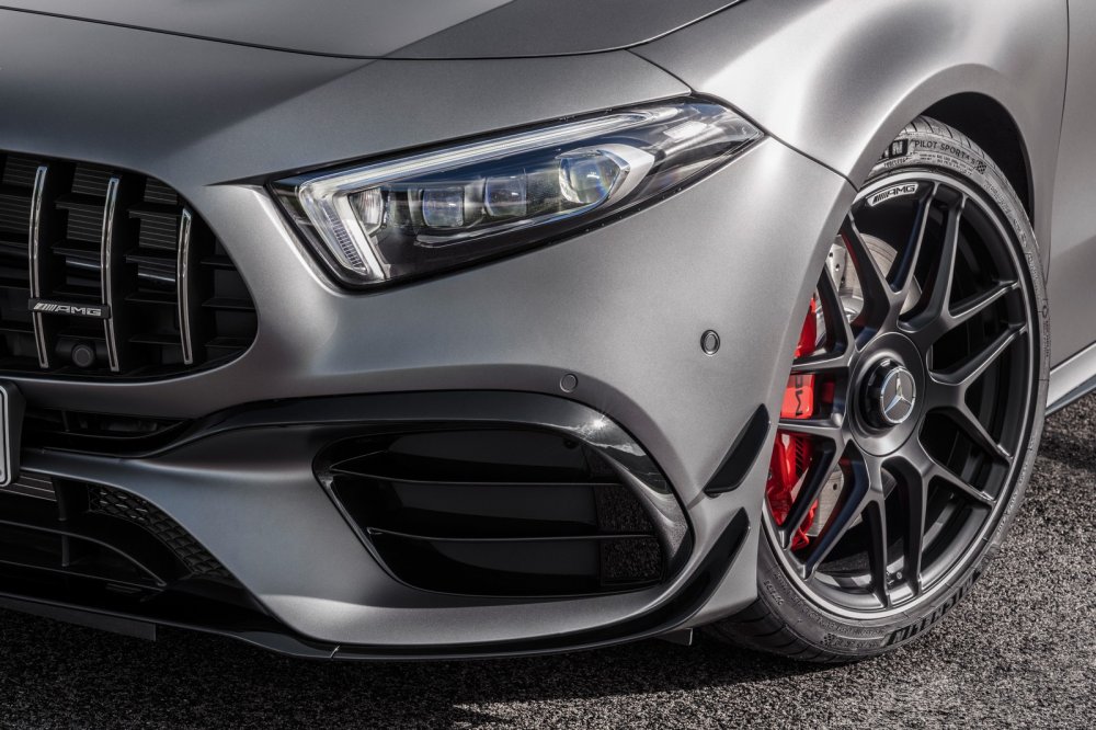 В семействе А-класса уже есть заряженные версии с индексом 35, снабжённые 2,0-литровым турбомотором мощностью 306 л.с., но это теперь лишь начальный уровень заводской прокачки, и для того, чтобы почувствовать по-настоящему впечатляющую динамику, нужно копить денежки на «сорок пятые» модификации. На них ставится совершенно новый двигатель M 139, о котором мы подробно рассказывали месяц назад. Благодаря ряду технических ухищрений его максимальная отдача с двух литрах рабочего объёма составляет 421 л.с. при 6750 об/мин и 500 Нм при 5000-5250 об/мин, но такие показатели доступны лишь для хэтчбеков и седанов, помеченных литерой S, а на базовых A 45 и CLA 45 мотор выдаёт 387 л.с. при 6500 об/мин и 480 Нм при 4750-5000 об/мин – тоже немало, но ясно, что «база» – это маркетинговый приём, призванный раскрутить покупателя на покупку более дорогих «эсок», у которых помимо более мощного двигателя есть и другие уникальные «фишки». Например, на «эски» ставятся более крупные передние тормоза с дисками диаметром 360 мм и 6-поршневыми суппортами против 350 мм и 4-поршневых суппортов на базовых исполнениях. И только для «эсок» доступны 19-дюймовые колёса, а ведь размер «катков» на спорткаре сильно влияет на эстетическое восприятие.