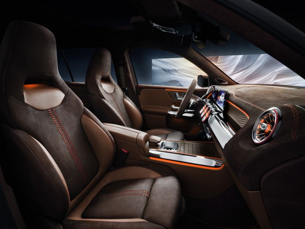 Интерьер концепта набран из хорошо известных по А-классу элементов, но сдобрен показушной отделкой, вроде натурального дерева с 3D-текстурой и металлических палок, призванных внушать водителю и пассажирам чувство защищённости. Кресла третьего ряда, судя по снимкам, – детские, то есть взрослые здесь вряд ли поместятся, но есть возможность подвинуть диван второго ряда вперёд на 90 мм, чтобы всё-таки высвободить дополнительное пространство для ступней и коленей.