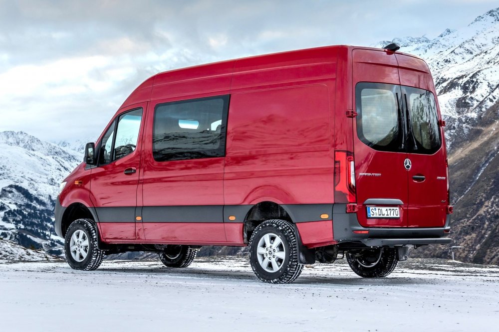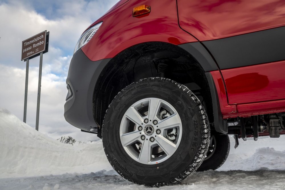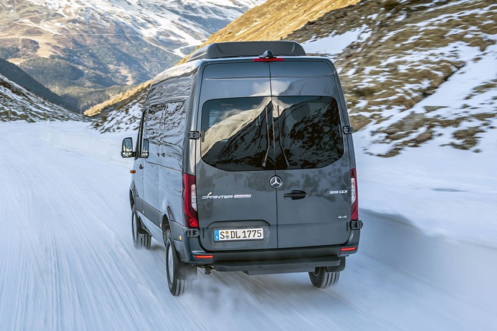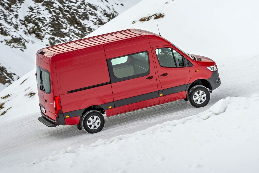 Со сменой поколений система полного привода Спринтера принципиально не изменилась: раздаточная коробка по-прежнему делит крутящий момент в соотношении 35:65 в пользу задней оси, при этом режим 4×4 сделан подключаемым – он активируется кнопкой на скорости до 10 км/ч. Блокировок дифференциалов нет – лишь их имитация тормозными механизмами, зато в виде опции предлагается понижающая передача (1,42), что по формальным признакам превращает Sprinter 4×4 в настоящий внедорожник. Также в списке опций имеется система помощи при движении по уклону (как вверх, так и вниз), а дополнительным подспорьем на бездорожье станет возможность кратковременного отключения противобуксовочной системы. И всё же отсутствие механических блокировок стоит признать недостатком: их имитация может привести к перегреву тормозов, и тогда придётся встать на маршруте, чтобы дать им остыть.