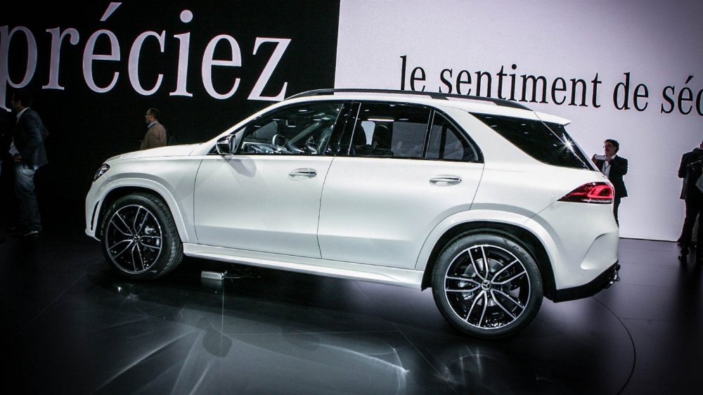 На стенде машины стояли близко друг к другу, поэтому ни на фото, ни на видео не удаётся передать «живого» впечатления от пропорций нового GLE, зато практически с любого ракурса хорошо видно, как дизайнеры постарались создать стилистическую преемственность поколений GLE – обратите внимание на исполнение третьей стойки и характер бокового остекления задних секций.