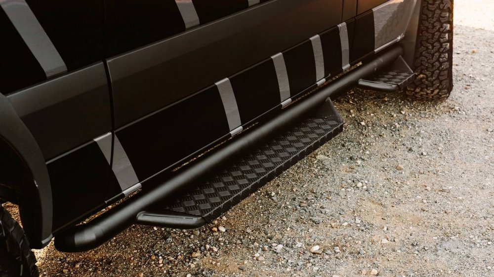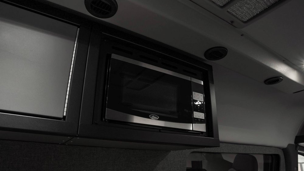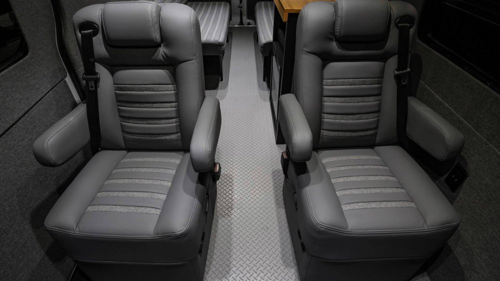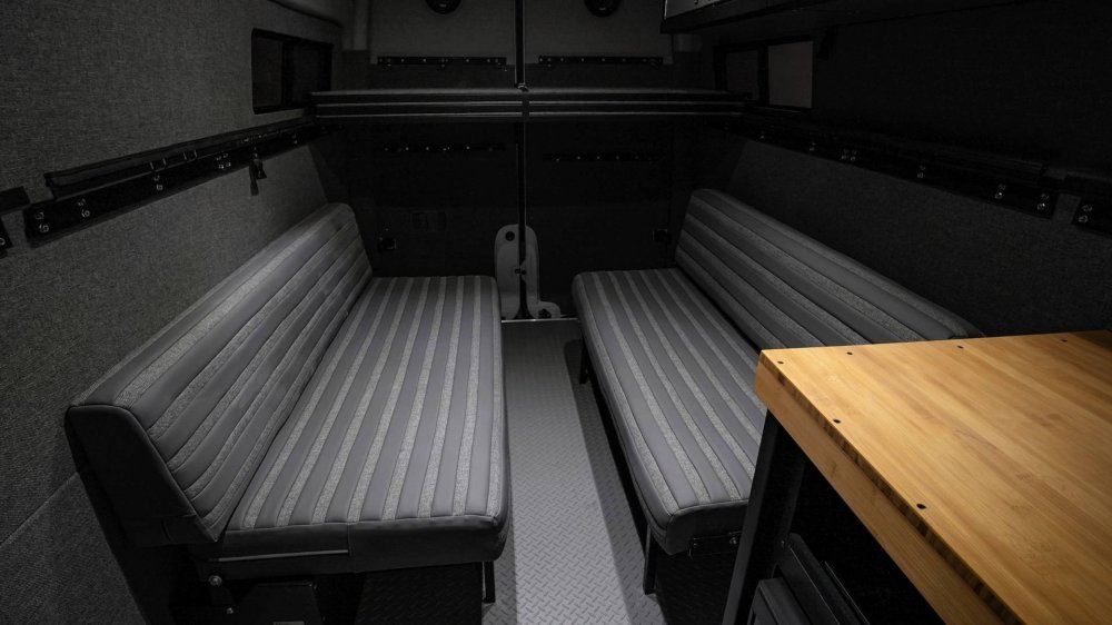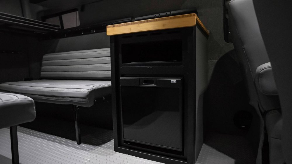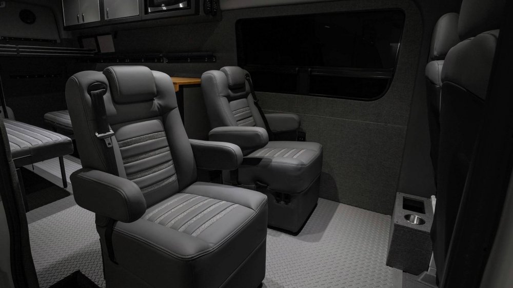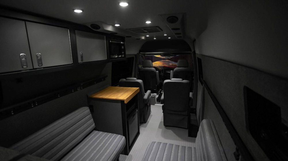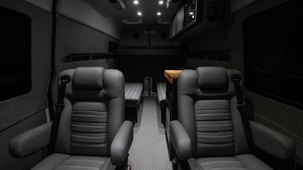 В интерьере выполнена карбоновая отделка, замшевая обивка потолка и стен, на которых размещается регулируемая атмосферная подсветка в сочетании с индивидуальными светильниками для чтения. В передней части салона установлен мини-холодильник, а набор развлекательной электроники включает Wi-Fi, Apple TV, DVD-плеер Alpine и 24-дюймовый телевизор. Имеется также система кругового видеообзора и набор розеток – 110-вольтовых и 12-вольтовых USB.