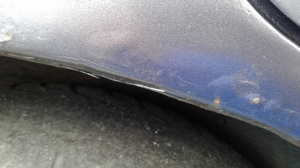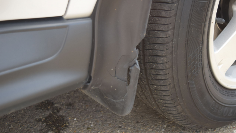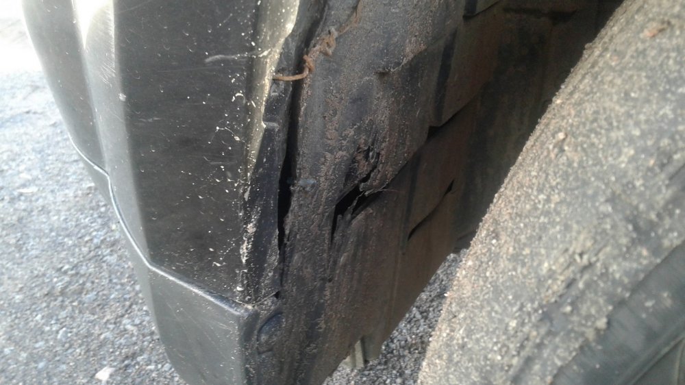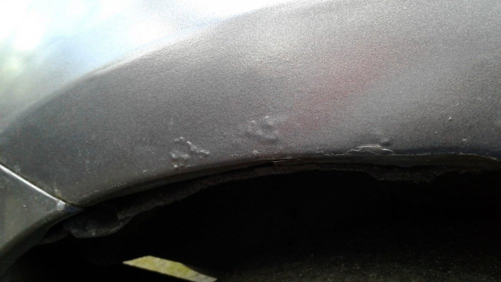 Владелец изо всех сил боролся со сколами с помощью кисточки и краски. Выглядит так себе, но ржавчины нет. Правда, несколько сколов, до которых бойкая кисточка дотянуться не успела, ржаветь всё-таки начали. И ладно бы арки или пороги — им положено ржаветь. Но машину когда-то стукнули передом, бампер сместился и повредил ЛКП на передних крыльях. И тут ржавчина, конечно же, уже полезла вовсю. Ну а отвалившийся подкрылок ставить на штатные крепления посчитали излишним и привязали проволокой.