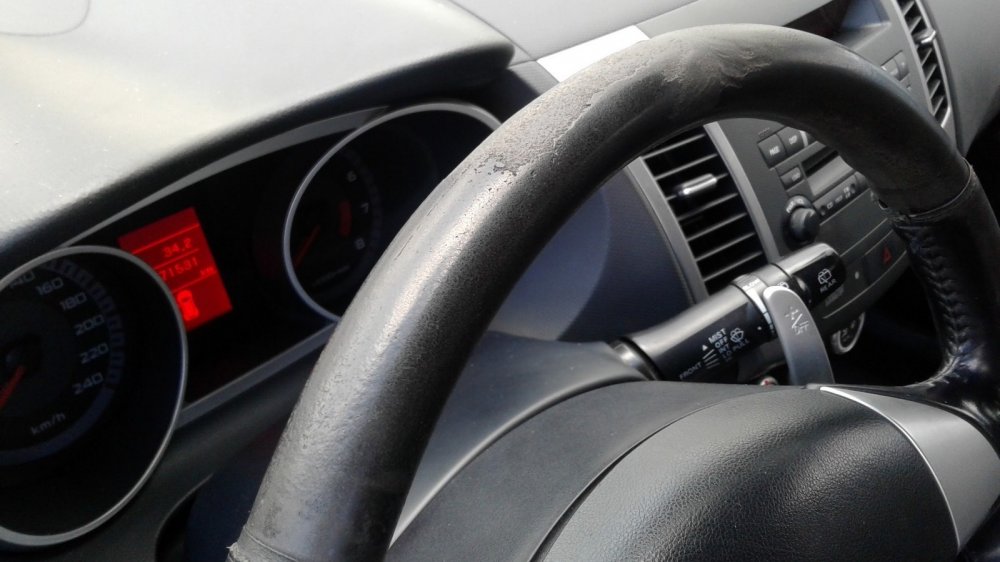 Про салон даже говорить не буду. Всё, что могло — облезло, что не могло — облезло тоже. И еще попрошу вас обратить внимание на состояние обода руля.