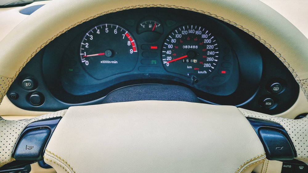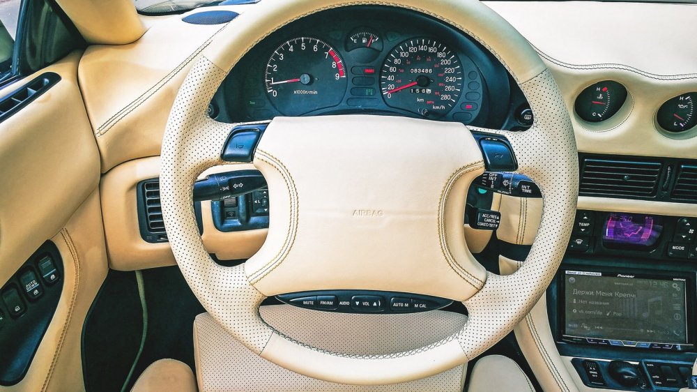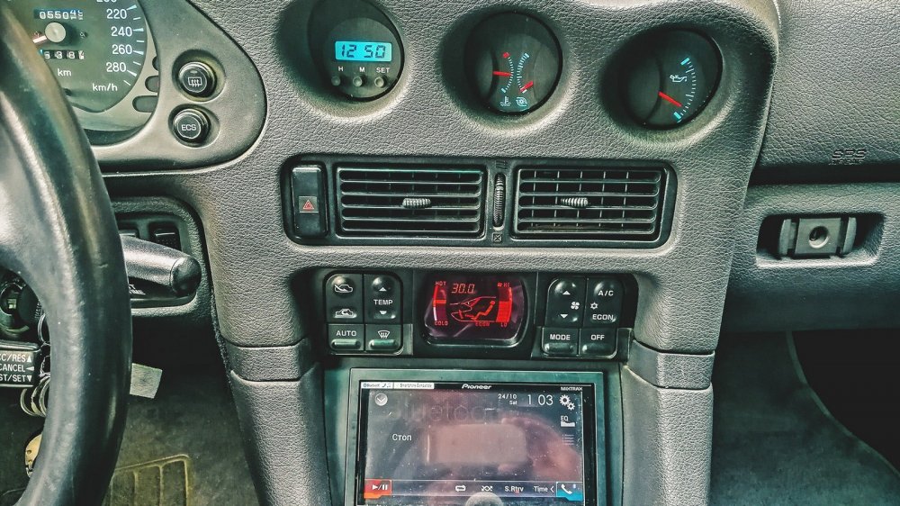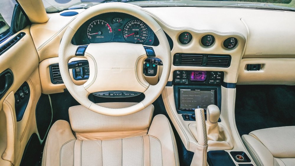 В интерьере 3000GT дружно уживаются по BMW-шному развернутая к водителю центральная консоль, увенчанная троицей дополнительных приборов в стиле Alfa Romeo, и лезущий из всех щелей японский хай-тек 90-х. Кнопки управления музыкой выстроились в ряд на нижней части центральной вставки руля, есть круиз-контроль, а блок управления климатом щеголяет крупным цветным дисплеем — и это только начало.