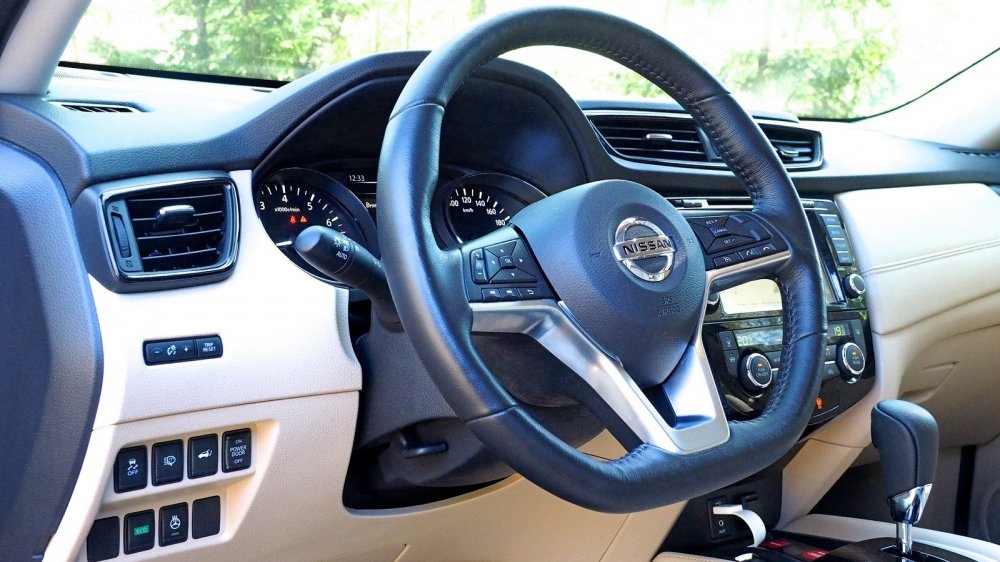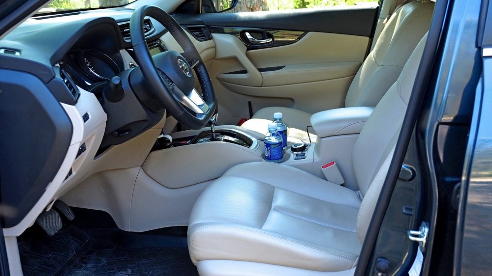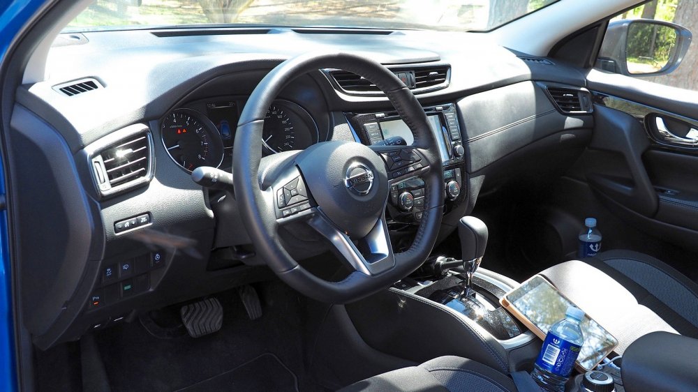 Прежде чем рассказать о своих ощущениях от “дерби”, я все же хотел бы напомнить, какие изменения произошли в обновленных моделях. Начнем с Qashqai… Хромированная “V” на решетке облицовки радиатора стала более массивной, добавив облику солидности и окончательно стерев отличия в имидже Qashqai X-Trail. А вот изменения в салоне можно назвать весьма существенными… Новый (и очень ухватистый) мультируль с подогревом, срезанным снизу сегментом и жестковатой кожей, мягкая обивка передней панели панели, 7-дюймовый тачскрин системы Nissan Connect, электропривод сидения переднего пассажира и подогрев подушек и спинок заднего ряда. Всё это производит приятное впечатление. А главное — ушли в прошлое несуразные пластиковые «под алюминий», добавлявшие интерьеру дешевизны. Естественно, маркетологи Nissan, вслед за коллегами из Toyota, тут же начали говорить об «ощущении премиальности».