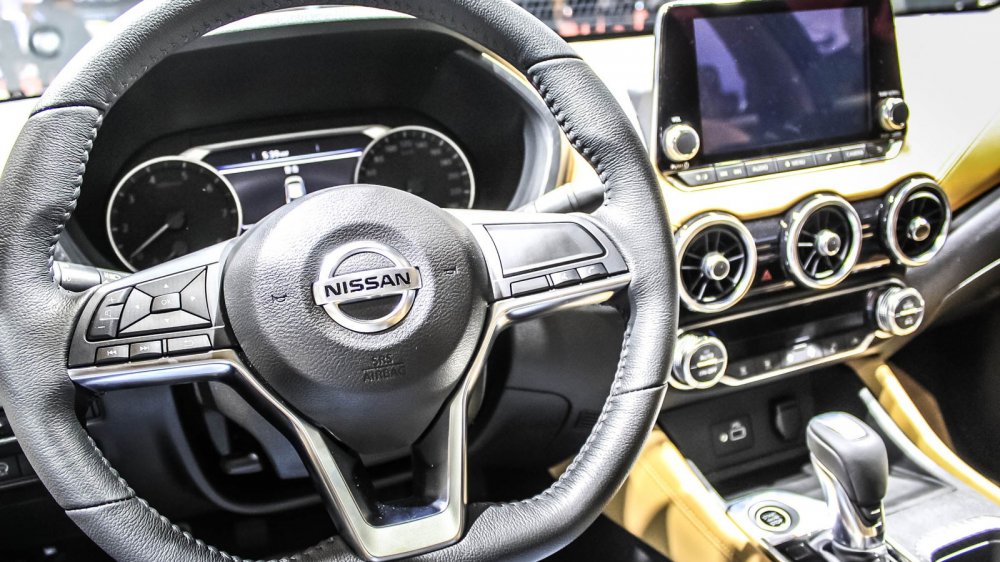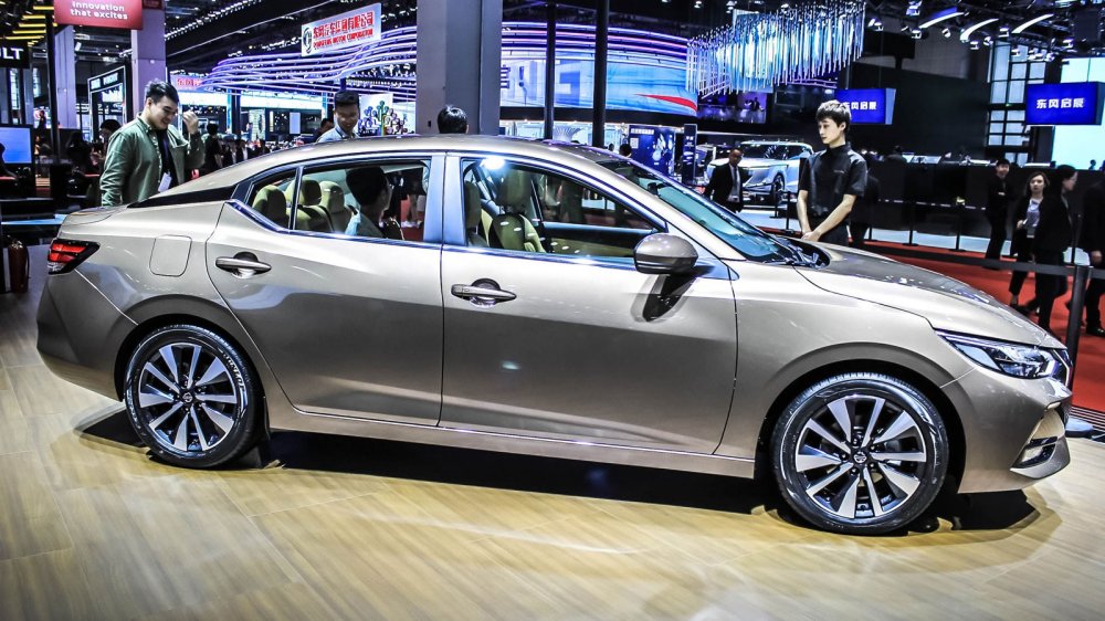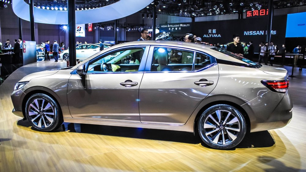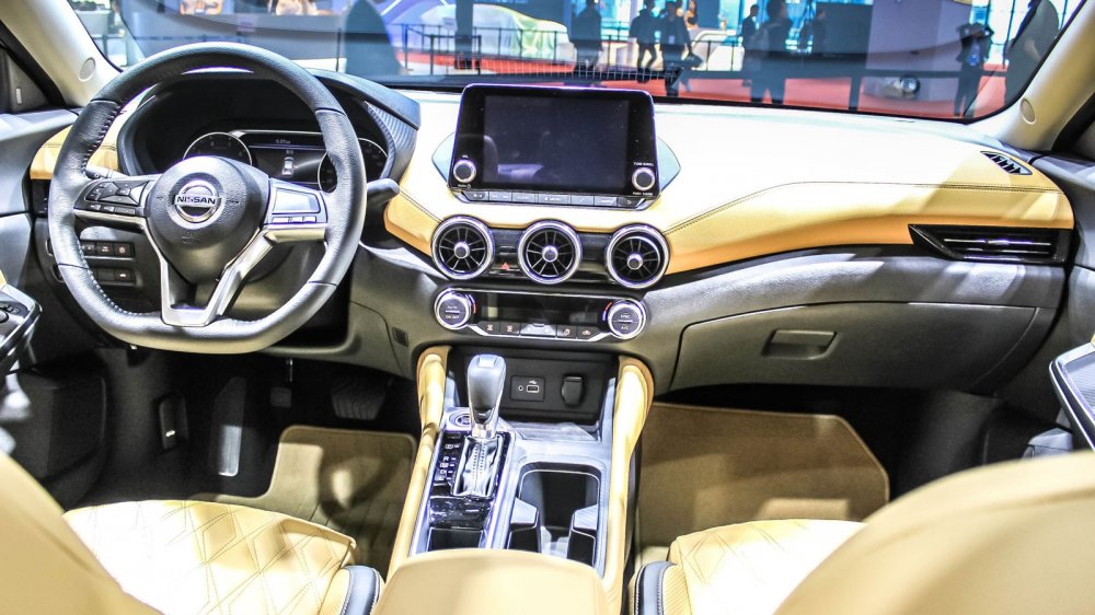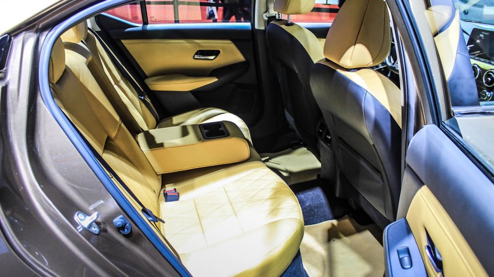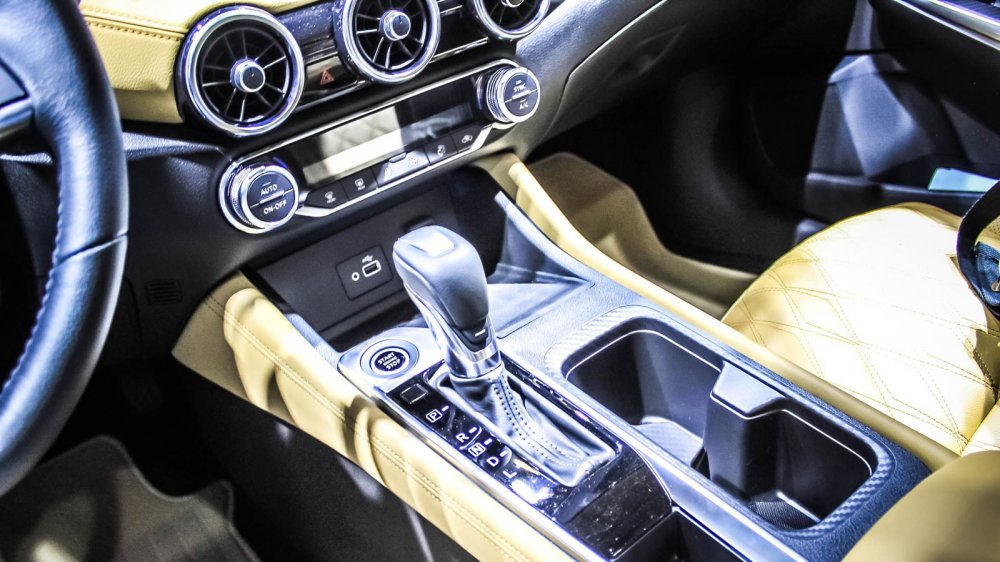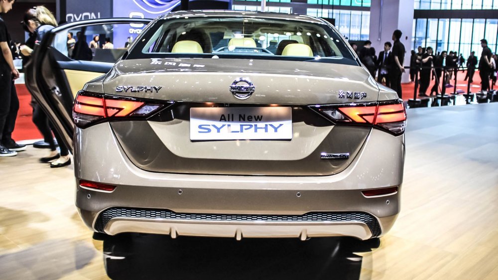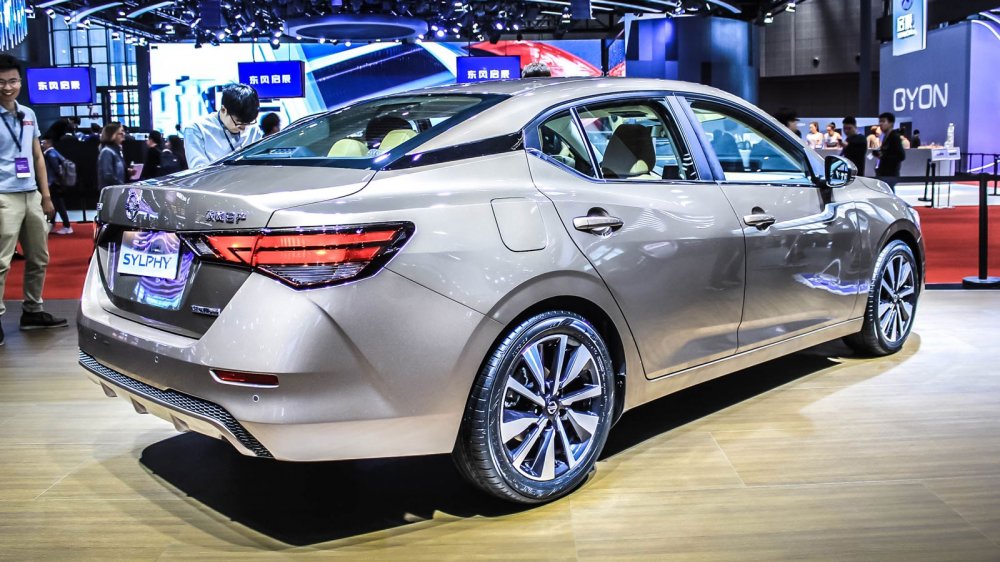 Интерьер выглядит богато: на стенде представили модель в коричневом цвете, а именно для неё предлагается особенный стёганый узор на креслах – «алмазный». Также Sylphy можно будет купить с чёрным или светло-серым салоном. Помимо этого у новой «четырёхдверки» двухцветная передняя панель, иной центральный тоннель (теперь с кнопкой запуска двигателя), оформленный в виде планшета восьмидюймовый дисплей мультимедийной системы с двумя аналоговыми «крутилками» и физическими кнопками снизу, а также семидюймовый экран в приборке, на который выводятся показания датчиков автомобиля.