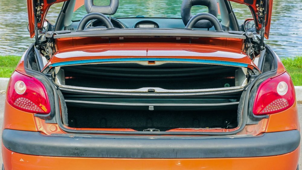 И ведь получилось! Апельсиновый Peugeot хорош со всех сторон, в любом из двух образов. С крышей подражает приземистым спорткарам, без оной — соблазняет чистотой линий и взглядом миндалевидных фар. Находящаяся в зоне риска у всех «трансформеров» задняя часть не просто удачно вписалась в дизайн исходника. Крышка багажника с продольными ребрами и поручнями по бокам — маленький шедевр сама по себе.