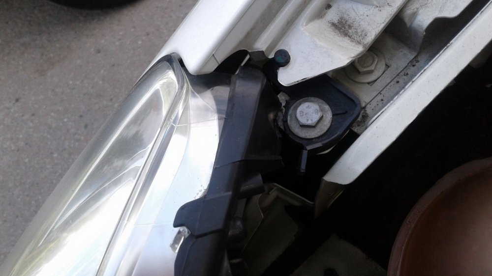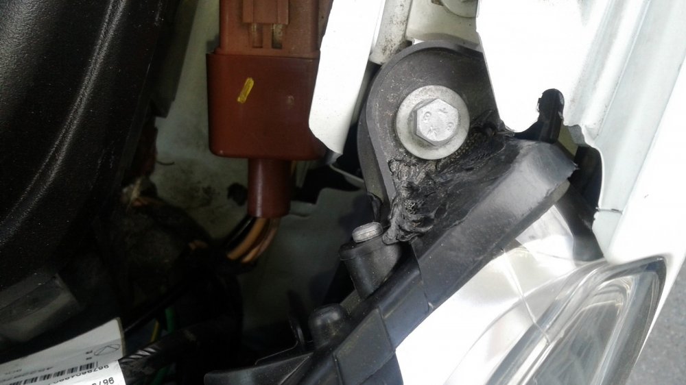 Следов ремонта на лонжеронах нет, но машину всё-таки били, пусть даже и не очень сильно. Об этом говорят, например, сломанные крепления обеих фар. Заодно становится понятно, почему правая фара “косая” — она вообще еле держится. А вот над левой поработали лучше — пластмассовое ушко, видимо, попытались восстановить паяльником, а уголок фары клеем прихватили к крылу. На века сделали, можно сказать. Надёжно.