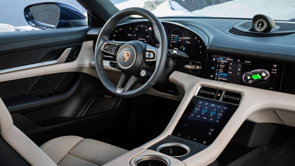 Интерьер выполнен в стилистике Porsche 911 последнего поколения, но здесь больше сенсорных панелей и полностью виртуальный щиток приборов.