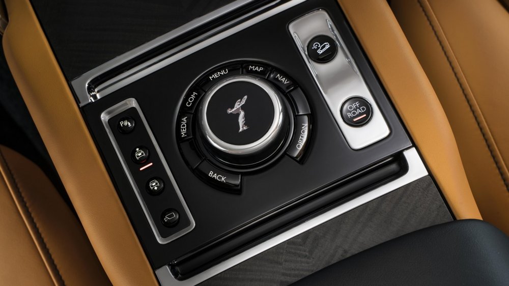 Впервые в модели Rolls-Royce появился сенсорный экран информационно-развлекательной системы, управляемой с помощью контроллера «Дух экстаза» на центральной консоли, рядом с которой есть кнопка включения режима Off-Road. Кстати, на фото она активирована вместе с функцией поднятия подвески.