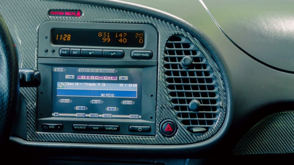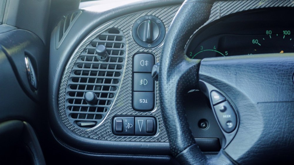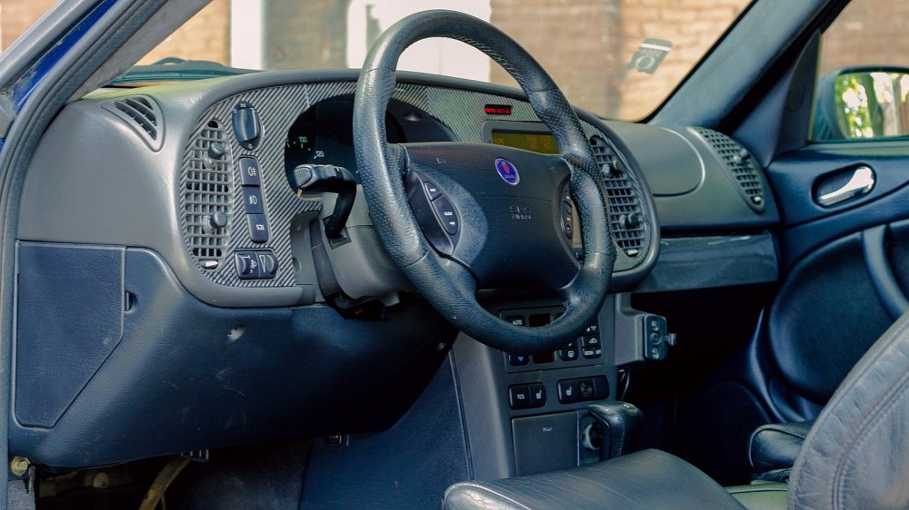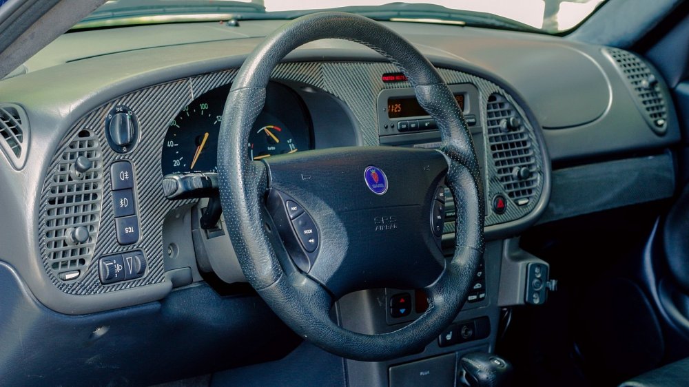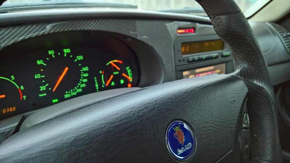 Сидя в стилизованном под кабину истребителя салоне, сложно заподозрить 9-3 в порочащих его связях с американским автопромом. Усеянная кнопками передняя панель с вертикальными воздуховодами повернута в мою сторону, как на классическом 900-м. Узнаваемый лаконизм приборной панели с зеленоватой подсветкой, надпись «Fasten belts», замок зажигания позади селектора коробки – добро пожаловать домой, дорогой саабер! В вот тебе и бонус в виде отделки натуральным карбоном и руля с педалями от Hirsch Performance.