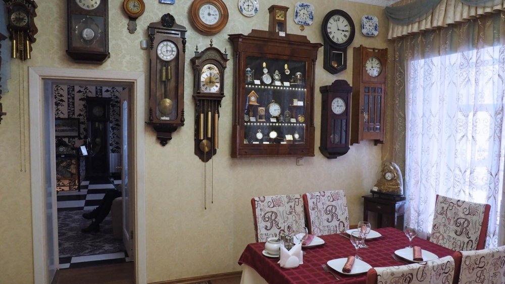 «Шарманка-шарлатанка, как сладко ты поешь, шарманка-шарлатанка, куда меня ведешь...» И что удивительно, все эти образцы точной механики работают! Кстати, коллекция передана в музей все тем же Олегом Жаровым, причем он и сам выступал в роли механика-реставратора. А музей-печатня «Страницы истории печатного дела»? Да что там, даже ресторан по сути представляет собой музей настенных и каминных часов, причем опять же — все ходят, отмеряют время…