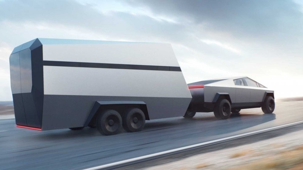 В профиль Cybertruck кажется однообъёмным, похожим на домик из-за излома крыши в районе передних дверей. Кузов длиной 1981 мм вмещает 2,8 кубометра груза под прочной металлической шторкой, которая выдвигается из заднего откидного борта. Её же можно использовать в качестве пандуса для погрузки в кузов квадроцикла – такой, судя по всему, в модельном ряду Tesla тоже скоро появится. Под условным капотом пикапа имеется дополнительный багажник, для мелких вещей предназначены пустоты в бортах. Грузоподъёмность пикапа – 1588 кг, масса буксируемого прицепа – от 3,4 до 6,35 т в зависимости от модификации.