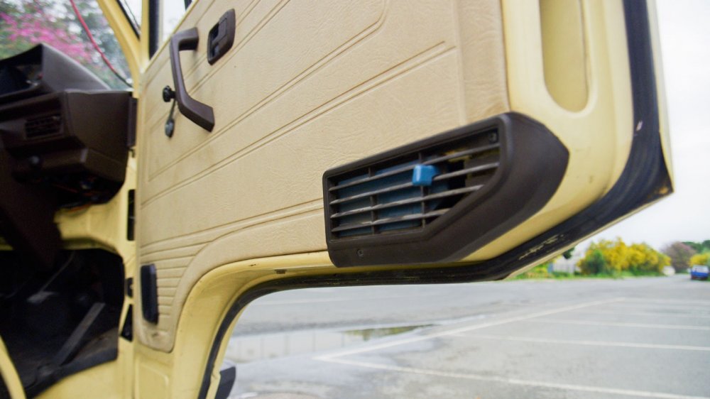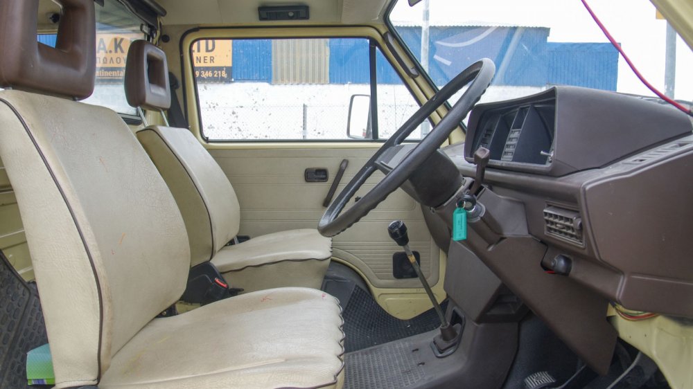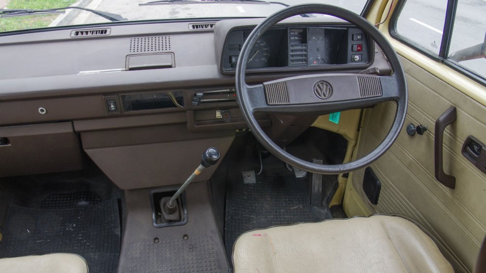 На нашей машине усилителя нет (хотя он был в списке опций), и управление совершенно бесхитростное. Можно было бы сказать, что на парковочных скоростях баранка тяжёлая, но не стану, чтобы не смешить читателей, знакомых, например, с ГАЗ-52. На самом деле, по меркам коммерческого транспорта 80-х вполне комфортно: “морда” у Т3 лёгкая в силу отсутствия двигателя спереди, диаметр рулевого колеса адекватный.