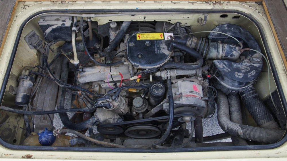На нашей машине стоит скромная 76-сильная карбюраторная версия объёмом 1.9 литра. Помимо неё были также 2.1-литровые, а в системе питания встречались также новомодные на тот момент вариации распределённого впрыска c электронным управлением от Bosch: Digijet и Digifant. Последняя отличалась тем, что ЭБУ контролировал не только инжектор, но и катушку зажигания.
