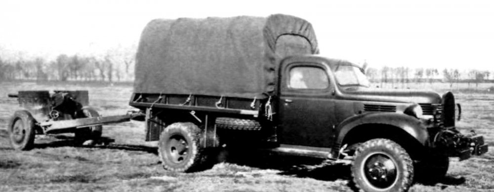 Автомобиль Dodge-T203В (VF405) буксирует 37-мм противотанковую пушку