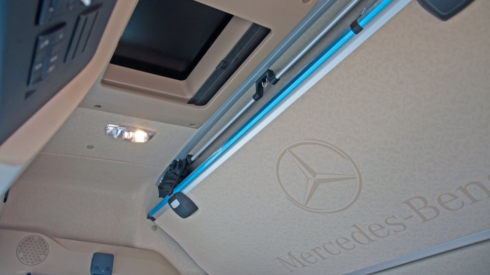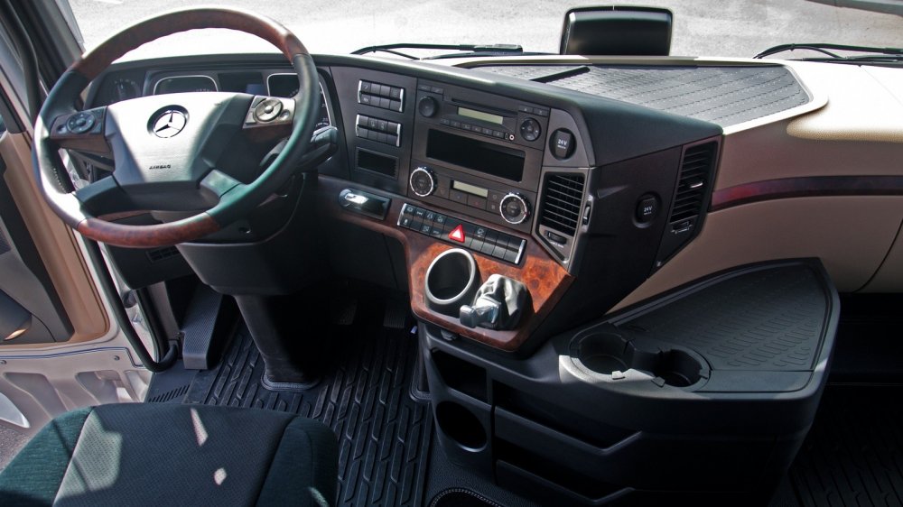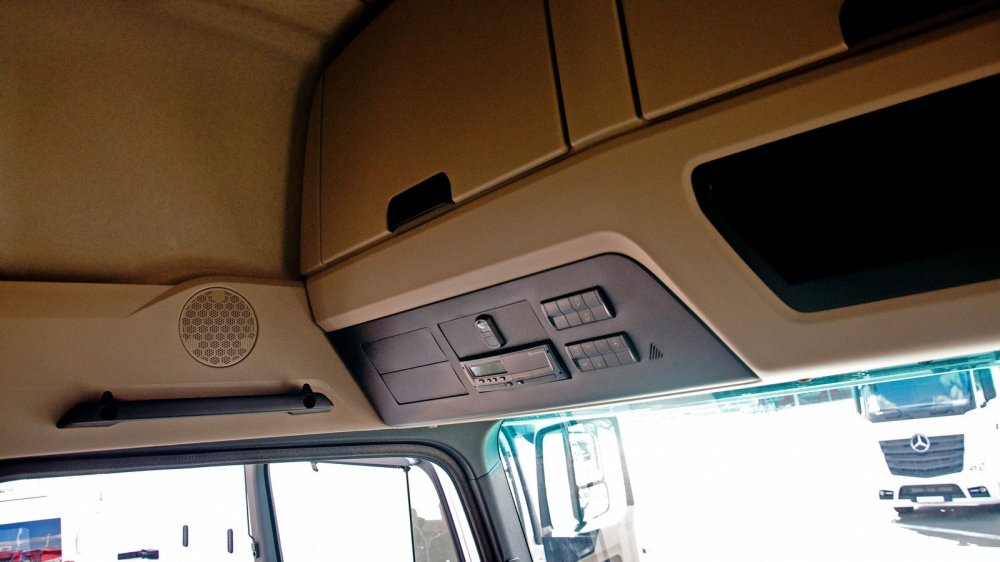 Мне попалась машина с кабиной GigaSpace — самой большой, какая может быть на Актросе. Её ширина, понятное дело, ограничена нашим законодательством — 2,5 метра, больше нельзя… А вот ходить по ней в полный рост можно легко: позволяют и высота, и ровный пол. Кстати, на следующем этапе мне досталась другая машина, с кабиной BigSpace. Теоретически, она на несколько сантиметров ниже, на практике — не теснее кухни в “хрущёвке”.