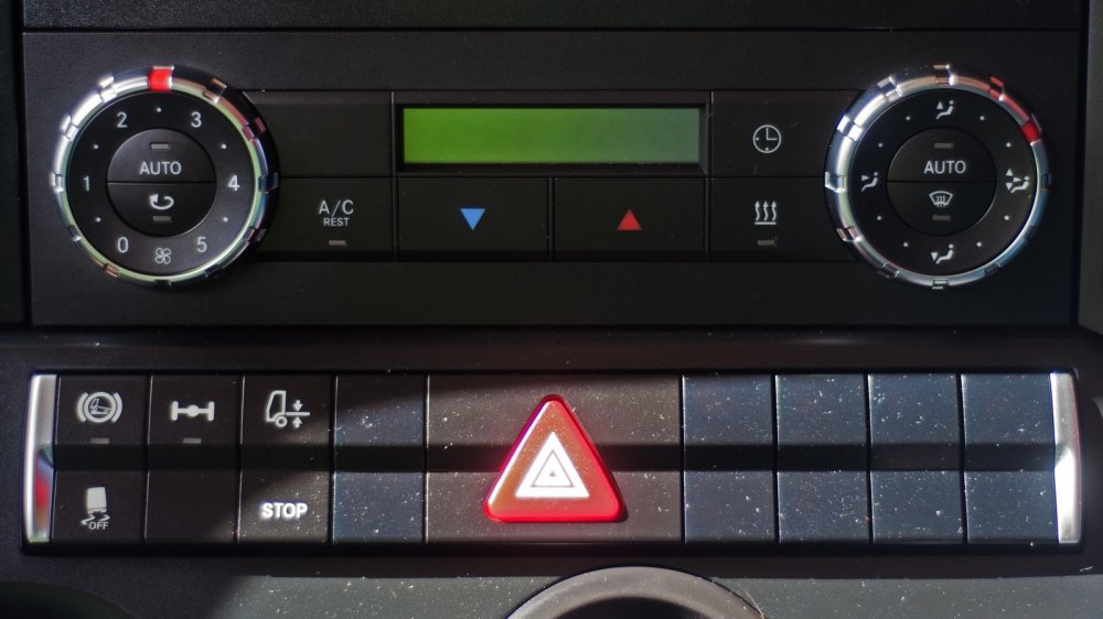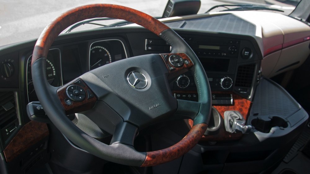 А вот органы управления и бортовой компьютер могут показаться несколько сложными и перегруженными. Чего только стоят подрулевые переключатели! На правом — управление роботизированной коробкой (что, впрочем, для Мерседеса — как легкового, так и грузового — нормально) и управление моторным тормозом. Он имеет несколько положений, и начинает работать, постепенно отключая три цилиндра, потом шесть, потом — прикрывая заслонку выпуска.