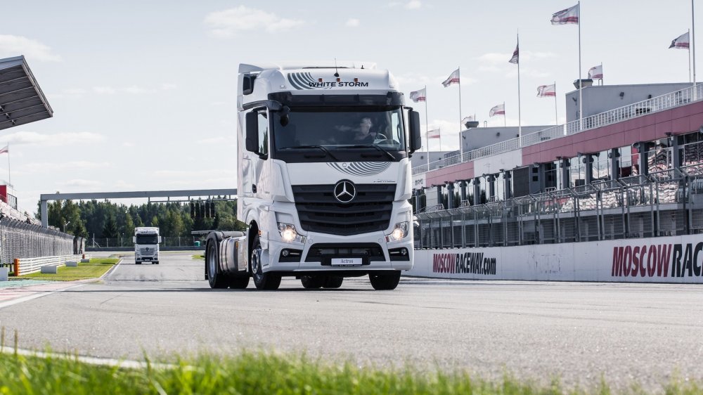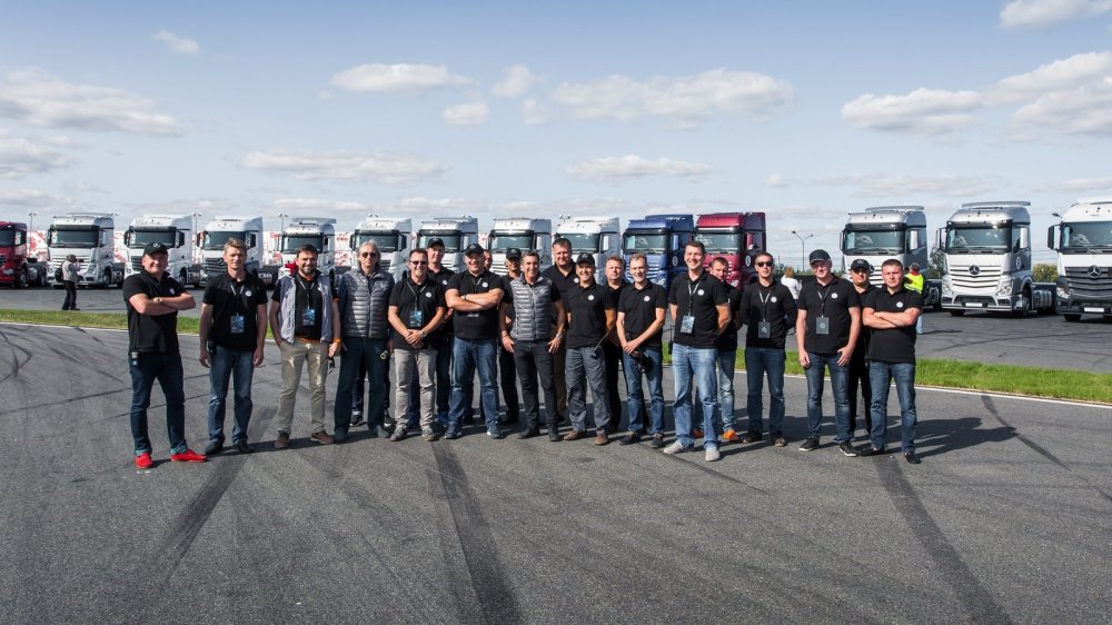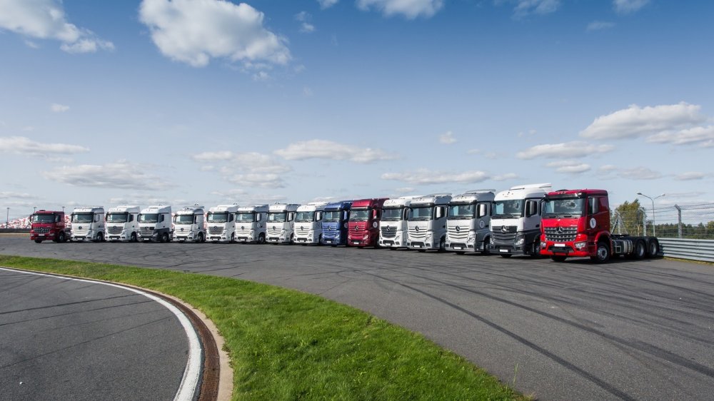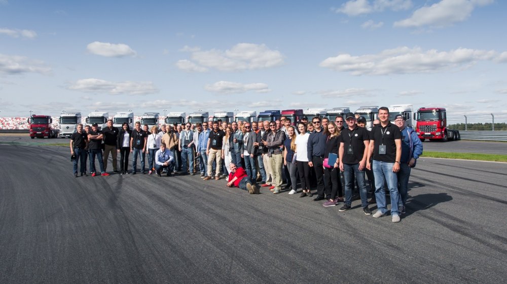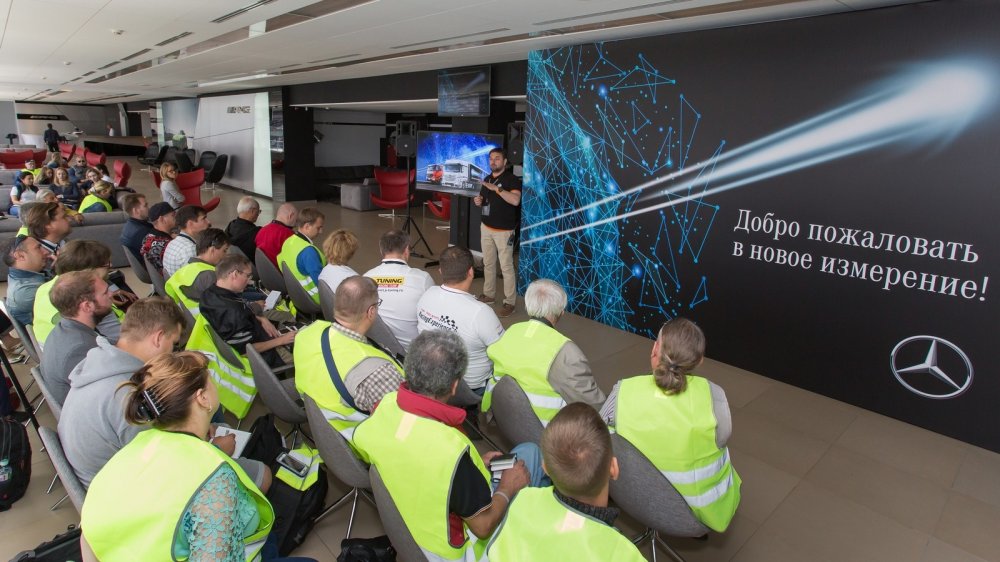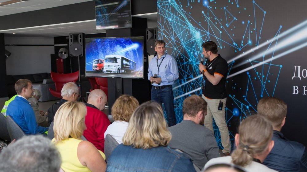 Презентовали новую машину как и положено Мерседесу — с помпой, круассанами и эффектными тестами. И сделали это не где-то, а на гоночной трассе Moscow Raceway. Правда, это не значит, что нам разрешили гонять по ней со слезящимися от счастья глазами: некоторые вещи нам могли продемонстрировать только профессиональные инструкторы из Германии, которых не жалко угробить не треке. Шутка. Которые умеют водить эти умные машины правильно. Заметьте, слово умные я не беру в кавычки — Actros действительно интеллектуально развиты намного больше многих современных людей.