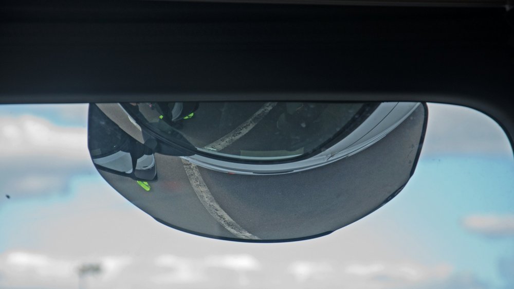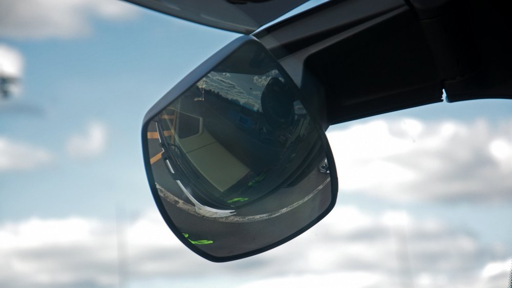 Второй заезд проходил на площадке, имитирующей плотную городскую застройку. Немало тут полегло конусов… Но претензии нужно высказывать тем, кто сидел за рулём, а не машинам. Чем бог не обделил Актроса — так это зеркалами. Причём самых причудливых форм. Боковые-то обычные, но есть ещё и те, которые позволяют видеть всё, что делается у правого колеса, и прямо перед носом тягача. Так что слепых зон тут нет, есть только слепые водители. Иногда появляется ощущение, что нагромождение зеркал сливается в левой стойкой и закрывает обзор, но это ощущение обманчиво. Зеркала стоят высоко и закрывают только часть неба, а всё, что происходит на дороге, видно отлично.