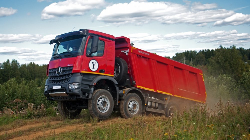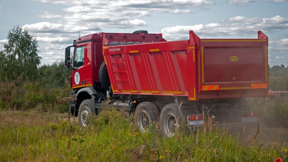 У обеих машин (Actros и Arocs) есть такая интересная штука, которая называется “система предусмотрительного управления силовой линией”. Грубо говоря, это электронный помощник, который позволяет плавно трогаться и проходить крутые подъёмы. Ну, а у нашего самосвала есть ещё и блокировка дифференциала, и даже специальный режим “робота”, который называется “автомат offroad”. И вот как раз с “автомат offroad” найти общий язык оказалось труднее всего. Нет, если не выпендриваться и просто ехать, то Arocs может просто ехать. Но как только машине становится тяжело, коробка начинает думать, что ей лучше включить. И дизель то начинает реветь, то перестаёт тянуть. В принципе, даже в таком режиме не встанешь — машина всё равно как-то выберется с тяжёлого участка, но лучше всё-таки заранее переходить в ручной режим и включать подходящие передачи.