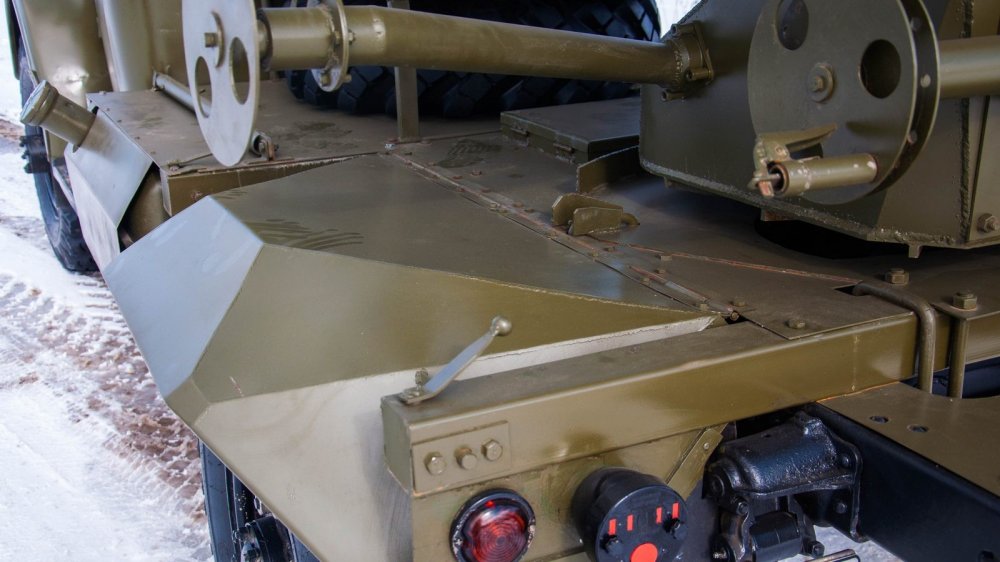 Ещё одно заметное отличие от других ГАЗ-63 — штатная лебёдка, установленная за передним бампером. Ну а чехлы на фарах и защита бензобака встречаются и на других военных ГАЗ-63.