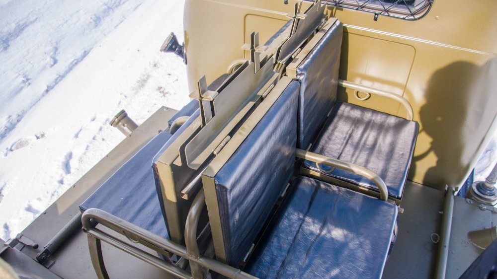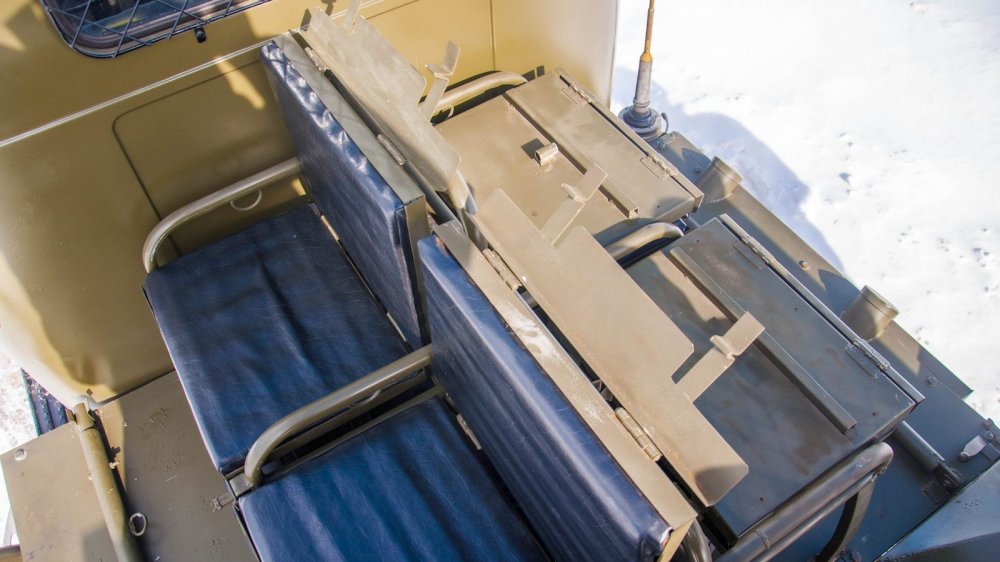 Во время марша личный состав сидит на четырёх откидных сиденьях, под которыми спрятано запасное колесо. При необходимости сиденья складываются и фиксируются металлическими застёжками. Командир машины, само собой, сидит в кабине рядом с водителем.