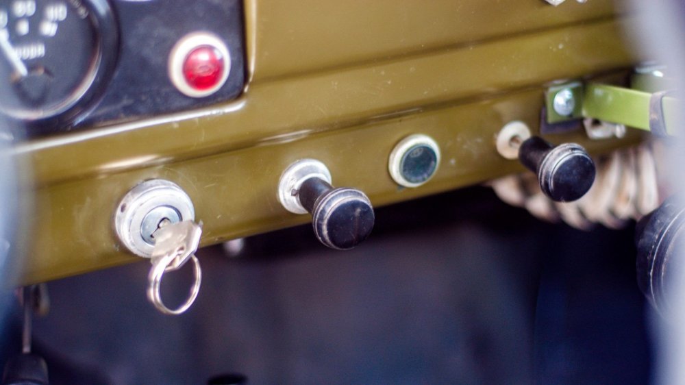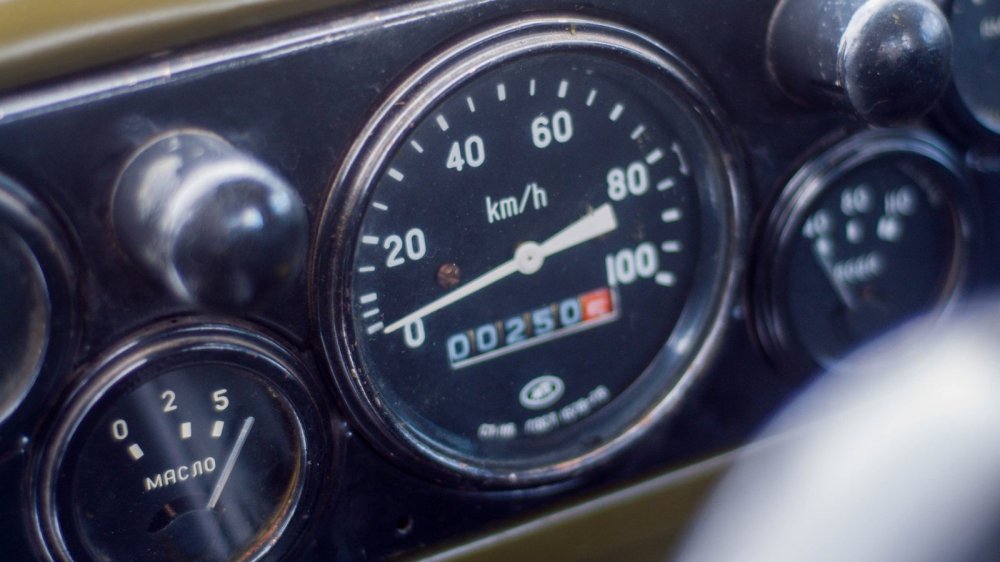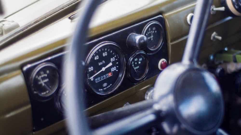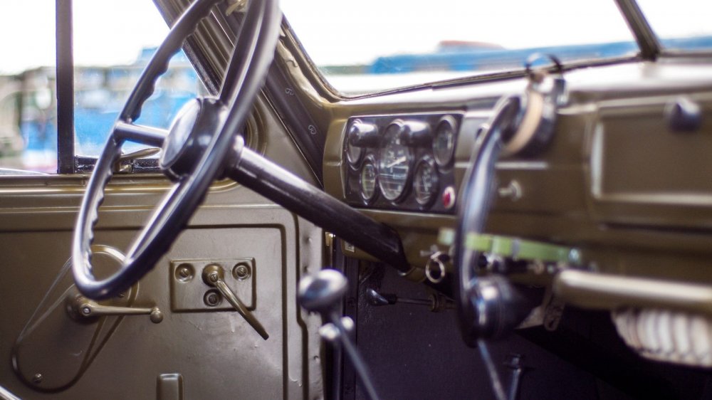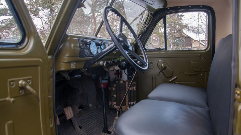 Внутри кабина ГАЗ-63 практически такая же, как у его заднеприводного собрата-"колхозника". Правда, тут есть рычаги раздаточной коробки и рация, но в остальном — то же самое. Интересно, что цвета сигнальных ламп нам показались бы немного неправильными: о включении дальнего света сигнализирует лампочка красного цвета, а о перегреве мотора — зелёная. Ну а всё остальное нам знакомо по десяткам других олдовых грузовиков, на которых мы с вами уже катались. Много железа, мало комфорта, размеченный ради лулзов до ста километров в час спидометр (максимальная скорость ГАЗ-63 — 65 км/ч) и несколько других самых необходимых приборов: амперметр, указатели уровня топлива, давления масла в моторе и температуры воды (антифризом тут, конечно, даже не пахло). Сядем на место водителя.