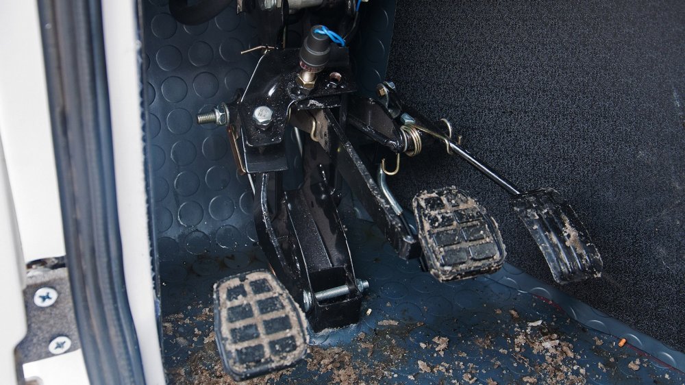 Вверху пространства получилось явно больше, чем внизу. Мои ножки в ботинках 45-го размера никак не могли найти себе места, зато руль оказался далековат. Хотя ногам всё равно пришлось хуже: педальный узел на мой размер обуви точно не рассчитан. К тому же все три педали зачем-то собрали в кучу и поставили так, чтобы одной ногой можно было давить сразу две педали. Одним словом, я против такого педального узла.