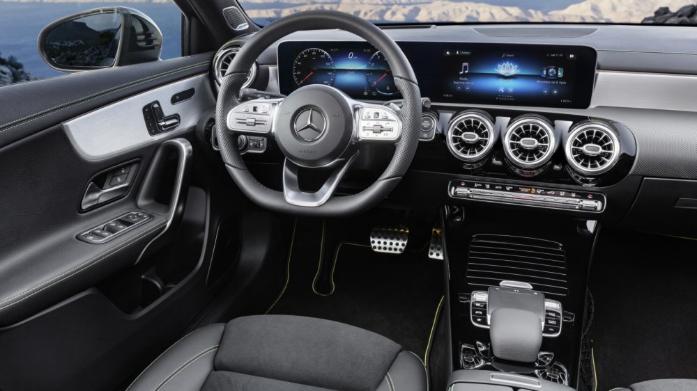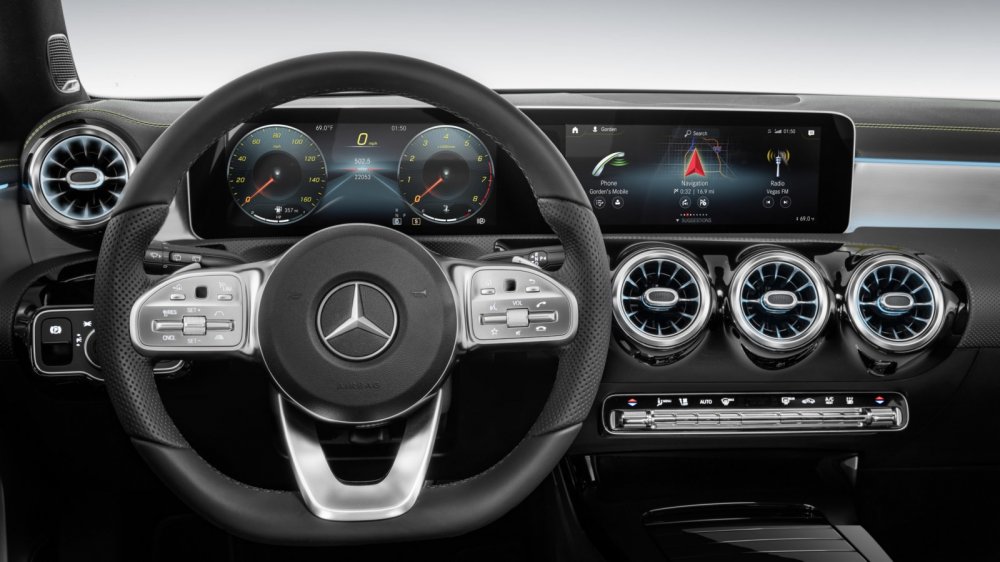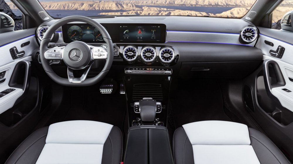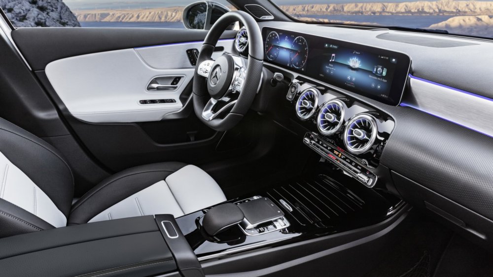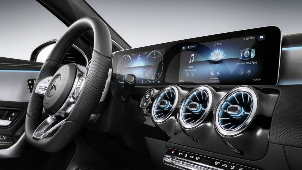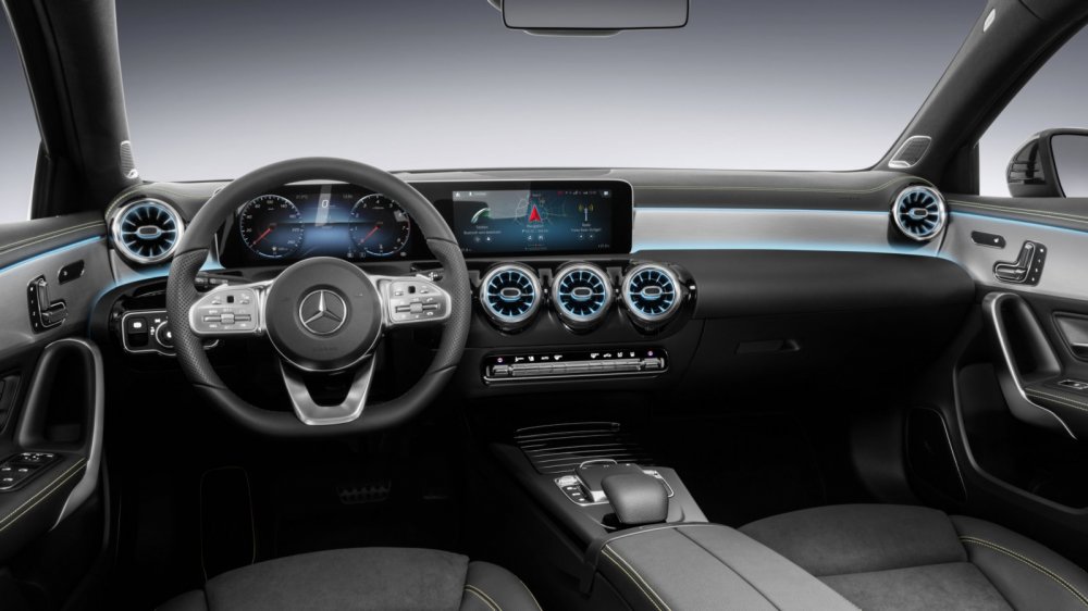 В салоне нового Mercedes-Benz A-Class существенно уменьшилось количество физических элементов управления. Появилось две цифровых панели диагональю 10,25 дюйма – один выполняет роль «приборки», а другой работает в составе новой информационно-развлекательной системы MBUX. Еще доступен тачпад (опция) на центральной панели для управления различными системами автомобиля. Имеется также система голосового управления, распознающая «натуральный язык», а не специальные команды. Запуск системы осуществляется фразой «Hey, Mercedes». За дополнительную плату можно добавить проекционный дисплей и продвинутую навигационную систему.
