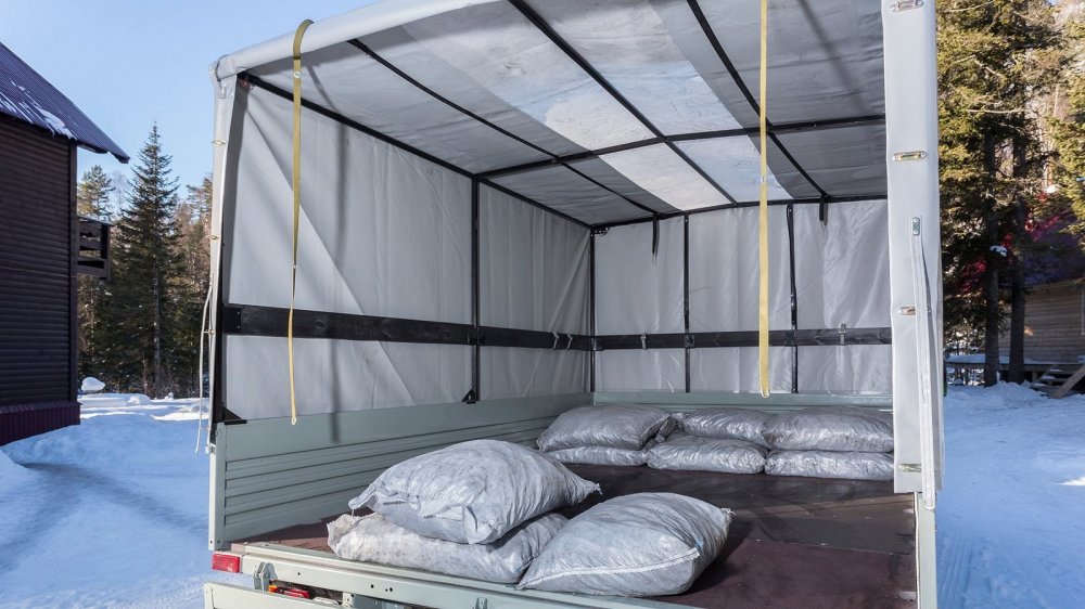 Итак, грузим уголь. Думаю, многие из вас знают, что для откидывания тента на другой российской полуторатонной машине используется хитрый девайс, известный в простонародье как швабра. Ею удобно толкать полог вверх, закидывая его на верх тента, после чего он при погрузке уже не мешает. Но тент УАЗа напичкан высокими технологиями, как бутылка шампанского пузырьками.
