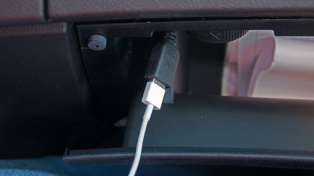 Не получается и синхронизировать телефон через USB. Ладно, чёрт с ним. Радио играет, нам хватит. А севший телефон можно поставить на зарядку, для чего в бардачке есть выход с коротеньким шнуром USB. Очень жаль, что придётся либо передавить провод зарядки крышкой бардачка, либо бросить телефон внутрь — иначе зарядить его не удастся. Выбираю второе.