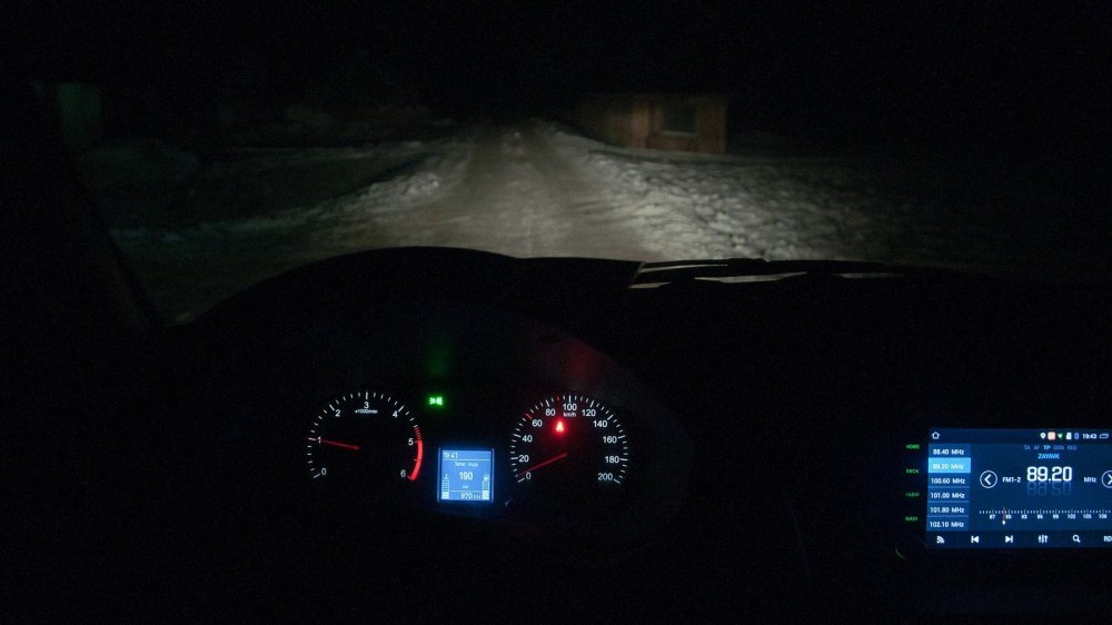 Последние километров 150 я ехал уже в темноте. Ближний свет у машины хороший, а вот дальний показал себя во всей красе только на пустой машине. С максимальной нагрузкой не помогал даже корректор фар, и дальний светил точно так же, как ближний, только не таким чётким пучком. Если дорогая незнакомая — лучше не гнать. К тому же пошёл снег, дорогу стало заметать, стало больше гололёда, и скорость в любом случае пришлось сбросить.