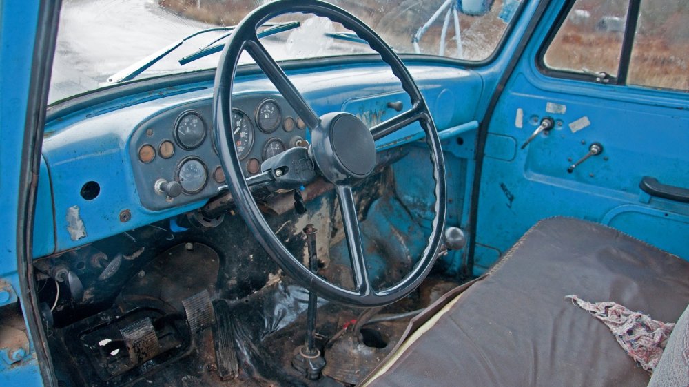 Очень удобно, что на панели перед пассажиром есть прочная ручка, за которую держаться удобно, но чертовски холодно. Прямо над ней — выштамповка в металлической панели. Тут могли стоять часы, но иногда в ней сверлили дыры и прятали там динамик магнитолы. Но это уже — самодельная “опция”. Наиболее частым решением было наклеивание изображения обнажённой женщины. А, нет — голой бабы. Это же “газон”.