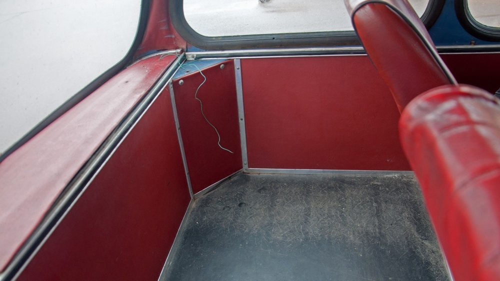 Пассажирские сиденья сюда хорошо подошли от РАФ-2203, от него же — передний щит кузова. Приборная панель — от автобуса ПАЗ-672. К сожалению, назначение всех кнопок на панели неизвестно даже специалистам музея RetroBus, где находится этот автобус. Ну, что поделать: в самодельной электрике всегда быстро может разобраться только тот, кто лазил по ней с изолентой и пассатижами.