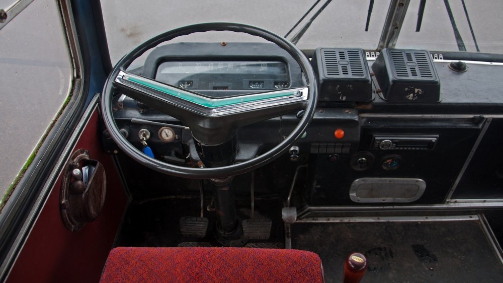 Посадка тут несколько странная. Она напоминает одновременно РАФ-2203, Дефендер и табуретку. Ну, с последним всё ясно — кресло на этом Икарусе явно не Bimarco и не UNP. Схожесть с “рафиком” объясняется кучей заимствованных элементов (кстати, на ГАЗ-24 тоже похоже, но автобус — не легковой автомобиль, поэтому точнее будет сравнение с РАФом). А вот о Дефендере мне напомнил мой левый локоть, который бился о стекло, не находя себе места в кабине: место водителя значительно смещено влево, и пространства для руки почти не остаётся.