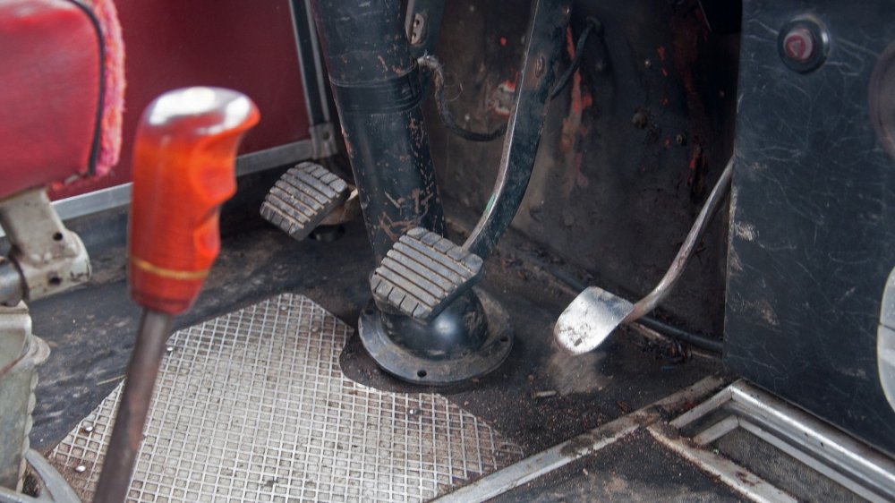 Снимаем автобус со стояночного тормоза. Кстати, он тоже тут “правильный” — от Икаруса. Выжимаем сцепление, включаем передачу и давим на газ.