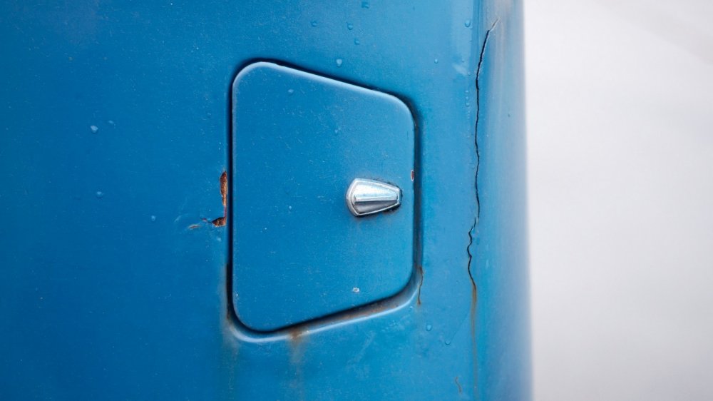 Пластиковая облицовка — от Волги. От неё же и фары с хромированными ободками. Если посмотреть с левого бока, то можно увидеть лючок бензобака, из которого тоже торчат волжские уши. Собственно, он тоже от ГАЗ-24, только стоит боком. А вот передние указатели поворотов настоящие, от Икаруса. Правда, на первоисточнике они стояли по бокам.