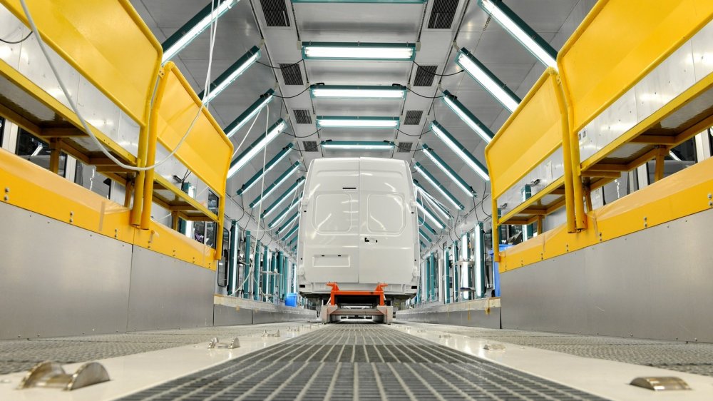 Вдоль главного конвейера есть несколько участков подсборки, где, например, собирают панели или сиденья. Делают это для того, чтобы не загромождать цех складами объёмных компонентов будущих автомобилей, а собирать всё строго в соответствии с производственным планом. В среднем отсюда каждые 80 секунд выходит новый автомобиль. Ну, или шасси для автобуса, сборку которого будет закачивать кто-то из дивизиона “Автобусы”.