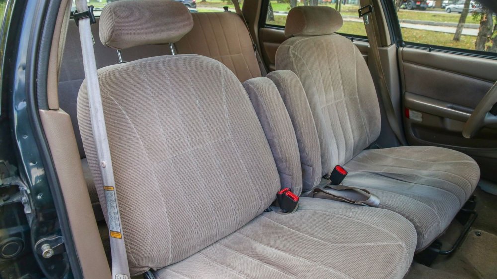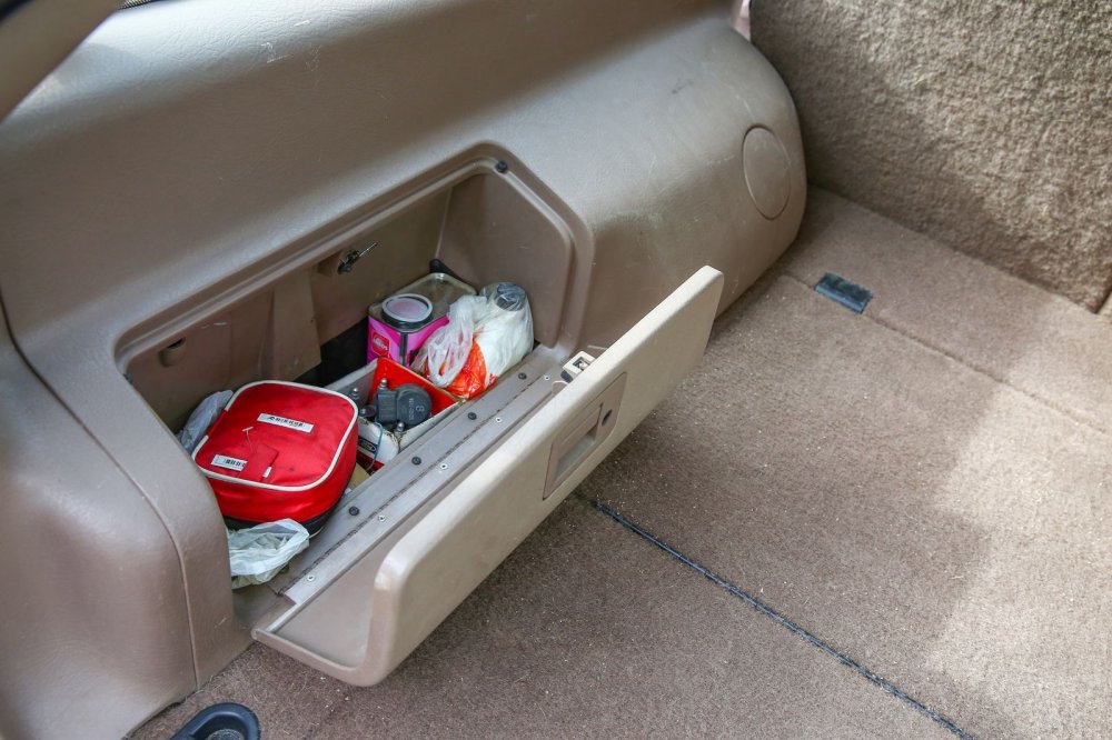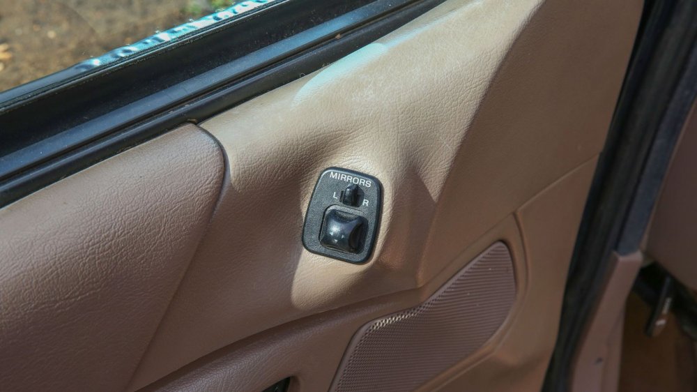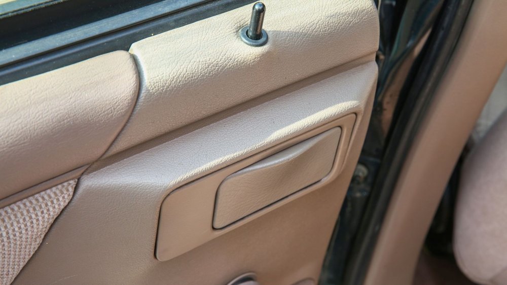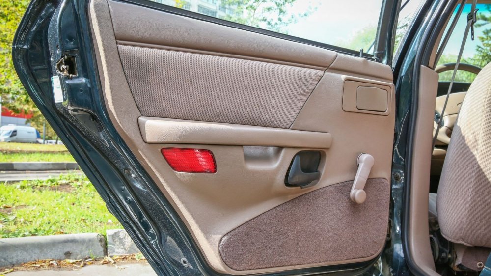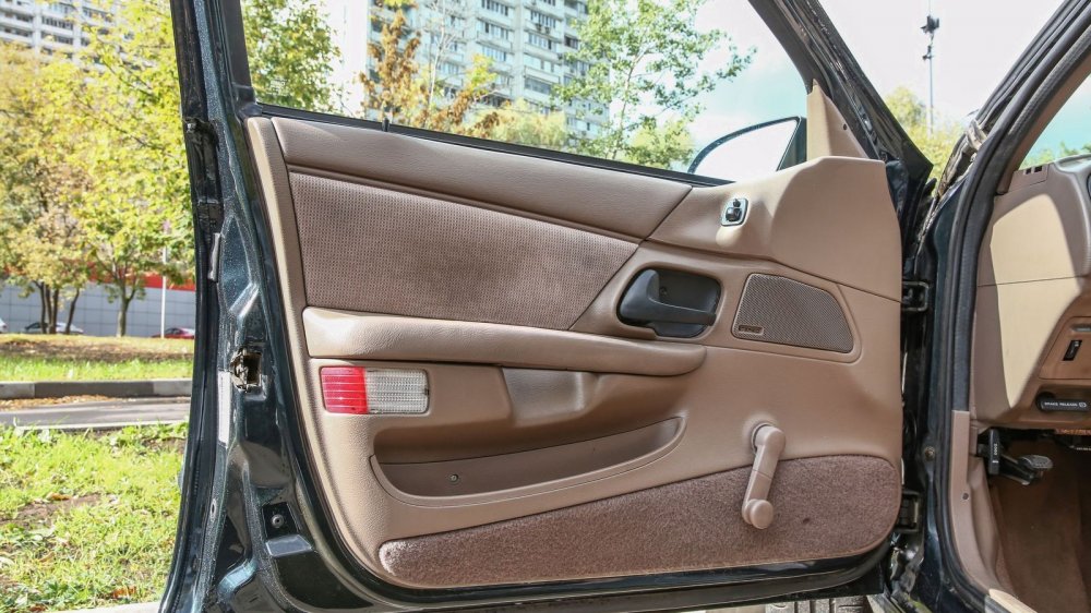 Несмотря на простейшую комплектацию, многие моменты выдают высокий для своего времени класс машины. К примеру, двери представляют собой сложную сборную конструкцию, в которой соединена масса отдельных элементов: два варианта тканевой отделки, два варианта эластичного винила разной фактуры и жесткости, блок электрорегулировки зеркал, подсветка ног и габаритный фонарь. На решетке динамика наклеен умилительный шильдик «stereo» – время моно ушло не так давно и стереозвуком гордились! Задняя пара динамиков, кстати, встроена в потолок – чтобы звук к пассажирам дивана шел свободно и не перекрывался вещами или ногами.
